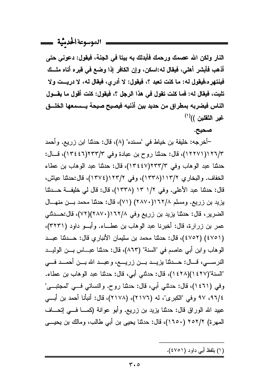 - أخرجه: خليفة بن خياط في "مسنده" (٨)، قال: حدثنا ابن زريع. وأحمد ٣/ ١٢٦ (١٢٢٧١)، قال: حدثنا روح بن عبادة وفي ٣/ ٢٣٣ (١٣٤٤٦)، قال: حدثنا عبد الوهاب وفي ٣/ ٢٣٣ (١٣٤٤٧)، قال: حدثنا عبد الوهاب بن عطاء الخفاف. والبخاري ٣/ ١١٢ (١٣٣٨)، وفي ٢/ ١٢٣ (١٣٧٤)، قال: حدثنا عياش، قال: حدثنا عبد الأعلى. وفي ١/ ١٣٢ (١٣٣٨)، قال: قال لي خليفة حدثنا يزيد بن زريع. ومسلم ٨/ ١٦٢ (٢٨٧٠) (٧١)، قال: حدثنا محمد بن منهال الضرير، قال: حدثنا يزيد بن زريع وفي ٨/ ١٦٢ (٢٨٧٠) (٧٢)، قال: حدثني عمر بن زرارة، قال: أخبرنا عبد الوهاب بن عطاء. وأبو داود (٣٢٣١)، (٤٧٥١) (٤٧٥٢)، قال: حدثنا محمد بن سليمان الأنباري قال: حدثنا عبد الوهاب وابن أبي عاصم في "السنة" (٨٦٣)، قال: حدثنا عباس بن الوليد النرسي، قال: حدثنا يزيد بن زريع، وعبد الله بن أحمد في "السنة" (١٤٢٧) (١٤٢٨)، قال: حدثني أبي، قال: حدثنا عبد الوهاب بن عطاء. وفي (١٤٦١)، قال: حدثني أبي، قال: حدثنا روح. والنسائي في "المجتبى" ٤/ ٩٦، ٩٧ وفي "الكبرى"، له (٢١٧٦)، (٢١٧٨)، قال: أنبأنا أحمد بن أبي عبيد الله الوراق قال: حدثنا يزيد بن زريع. وأبو عوانة (كما في إتحاف المهرة) ٢/ ٢٥٢ (١٦٥٠)، قال: حدثنا يحيى بن أبي طالب، ومالك بن يحيى