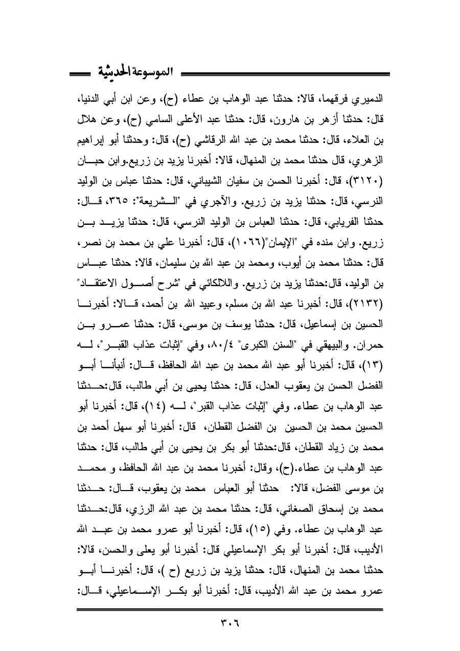 الدميري فرقهما، قالا: حدثنا عبد الوهاب بن عطاء (ح)، وعن ابن أبي الدنيا، قال: حدثنا أزهر بن هارون، قال: حدثنا عبد الأعلى السامي (ح)، وعن هلال بن العلاء، قال: حدثنا محمد بن عبد الله الرقاشي (ح)، قال: وحدثنا أبو إبراهيم الزهري، قال حدثنا محمد بن المنهال، قالا: أخبرنا يزيد بن زريع. وابن حبان (٣١٢٠)، قال: أخبرنا الحسن بن سفيان الشيباني، قال: حدثنا عباس بن الوليد النرسي، قال: حدثنا يزيد بن زريع. والآجري في "الشريعة": ٣٦٥، قال: حدثنا الفريابي، قال: حدثنا العباس بن الوليد النرسي، قال: حدثنا يزيد بن زريع. وابن منده في "الإيمان" (١٠٦٦)، قال: أخبرنا علي بن محمد بن نصر، قال: حدثنا محمد بن أيوب، ومحمد بن عبد الله بن سليمان، قالا: حدثنا عباس بن الوليد، قال: حدثنا يزيد بن زريع. واللاكائي في "شرح أصول الاعتقاد" (٢١٣٢)، قال: أخبرنا عبد الله بن مسلم، وعبيد الله بن أحمد، قالا: أخبرنا الحسين بن إسماعيل، قال: حدثنا يوسف بن موسى، قال: حدثنا عمرو بن حمران. والبيهقي في "السنن الكبرى" ٤/ ٨٠، وفي "إثبات عذاب القبر"، له (١٣)، قال: أخبرنا أبو عبد الله محمد بن عبد الله الحافظ، قال: أنبأنا أبو الفضل الحسن بن يعقوب العدل، قال: حدثنا يحيى بن أبي طالب، قال: حدثنا عبد الوهاب بن عطاء. وفي "إثبات عذاب القبر"، له (١٤)، قال: أخبرنا أبو الحسين محمد بن الحسين بن الفضل القطان، قال: أخبرنا أبو سهل أحمد بن محمد بن زياد القطان، قال: حدثنا أبو بكر بن يحيى بن أبي طالب، قال: حدثنا عبد الوهاب بن عطاء. (ح)، وقال: أخبرنا محمد بن عبد الله الحافظ، ومحمد بن موسى الفضل، قالا: حدثنا أبو العباس محمد بن يعقوب، قال: حدثنا محمد بن إسحاق الصغاني، قال: حدثنا محمد بن عبد الله الرزي، قال: حدثنا عبد الوهاب بن عطاء. وفي (١٥)، قال: أخبرنا أبو عمرو محمد بن عبد الله الأديب، قال: أخبرنا أبو بكر الإسماعيلي قال: أخبرنا أبو يعلى والحسن، قالا: حدثنا محمد بن المنهال، قال: حدثنا يزيد بن زريع (ح)، قال: أخبرنا أبو عمرو محمد بن عبد الله الأديب، قال: أخبرنا أبو بكر الإسماعيلي، قال: