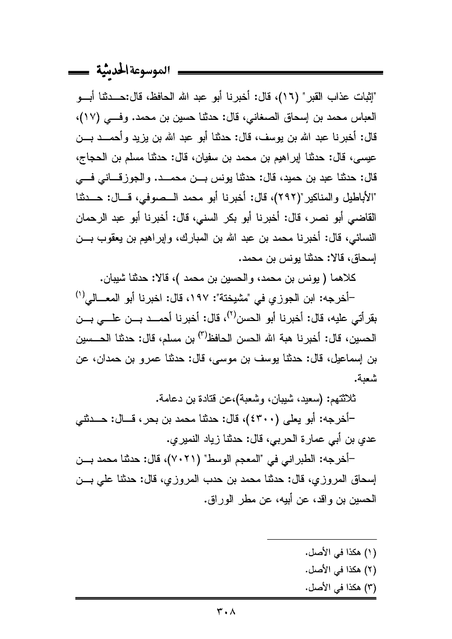 "إثبات عذاب القبر" (١٦)، قال: أخبرنا أبو عبد الله الحافظ، قال: حدثنا أبو العباس محمد بن إسحاق الصغاني، قال: حدثنا حسين بن محمد. وفي (١٧)، قال: أخبرنا عبد الله بن يوسف، قال: حدثنا أبو عبد الله بن يزيد وأحمد بن عيسى، قال: حدثنا إبراهيم بن محمد بن سفيان، قال: حدثنا مسلم بن الحجاج، قال: حدثنا عبد بن حميد، قال: حدثنا يونس بن محمد. والجوزقاني في "الأباطيل والمناكير" (٢٩٢)، قال: أخبرنا أبو محمد الصوفي، قال: حدثنا القاضي أبو نصر، قال: أخبرنا أبو بكر السني، قال: أخبرنا أبو عبد الرحمان النسائي، قال: أخبرنا محمد بن عبد الله بن المبارك، وإبراهيم بن يعقوب بن إسحاق، قالا: حدثنا يونس بن محمد.