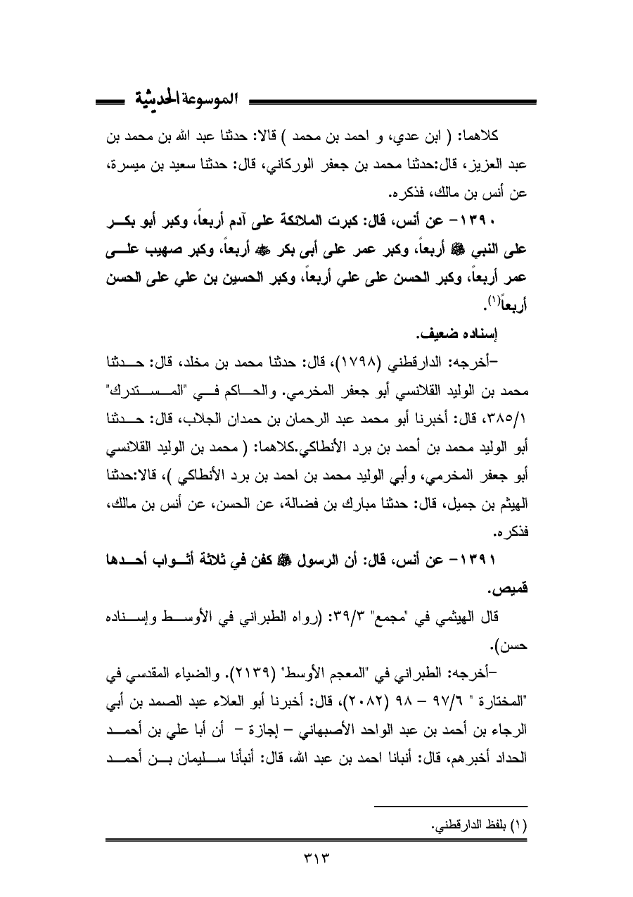 ١٣٩٠ - عن أنس، قال: كبرت الملائكة على آدم أربعًا، وكبر أبو بكر على النبي - صلى الله عليه وسلم - أربعًا، وكبر عمر على أبى بكر. - رضي الله عنه - أربعًا، وكبر صهيب على عمر أربعًا، وكبر الحسن على علي أربعًا، وكبر الحسين بن علي على الحسن أربعًا (¬١).
