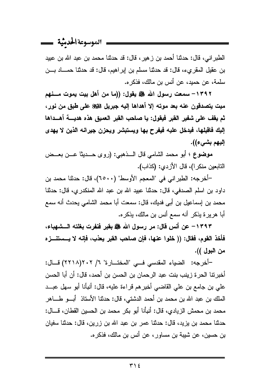 ١٣٩٣ - عن أنس قال: مر رسول الله - صلى الله عليه وسلم - بقبر فنفرت بغلته الشهباء، فأخذ القوم، فقال: "خلوا عنها، فإن صاحب القبر يعذب، فإنه لا يستنزه من البول".