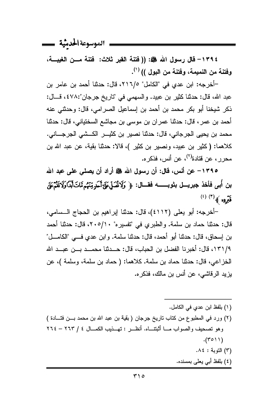 ١٣٩٥ - عن أنس، قال: أن رسول الله - صلى الله عليه وسلم - أراد أن يصلي على عبد الله بن أبى فأخذ جبريل بثوبه فقال: {وَلَا تُصَلِّ عَلَى أَحَدٍ مِنْهُمْ مَاتَ أَبَدًا وَلَا تَقُمْ عَلَى قَبْرِهِ إِ} أخرجه: أبو يعلى (٤١١٢)، قال: حدثنا إبراهيم بن الحجاج السامي، قال: حدثنا حماد بن سلمة. والطبري في "تفسيره" ١٠/ ٢٠٥، قال: حدثنا أحمد بن إسحاق، قال: حدثنا أبو أحمد، قال: حدثنا سلمة. وابن عدي في "الكامل" ٩/ ١٣١، قال: أخبرنا الفضل بن الحباب، قال: حدثنا محمد بن عبد الله الخزاعي، قال: حدثنا حماد بن سلمة. كلاهما: (حماد بن سلمة، وسلمة)، عن يزيد الرقاشي، عن أنس بن مالك، فذكره.