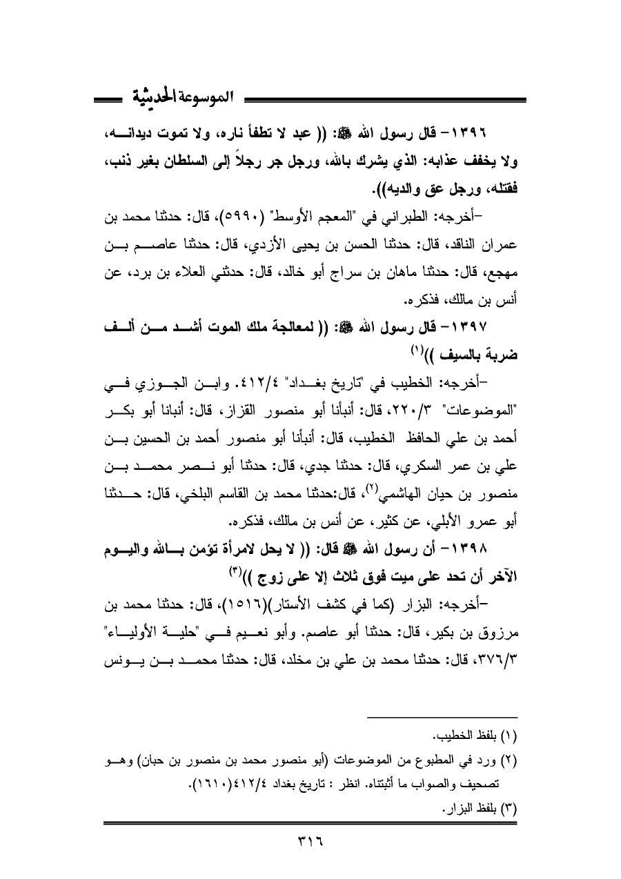 ١٣٩٦ - قال رسول الله - صلى الله عليه وسلم -: "عبد لا تطفأ ناره، ولا تموت ديدانه، ولا يخفف عذابه: الذي يشرك باللّه، ورجل جر رجلا إلى السلطان بغير ذنب، فقتله، ورجل عق والديه".