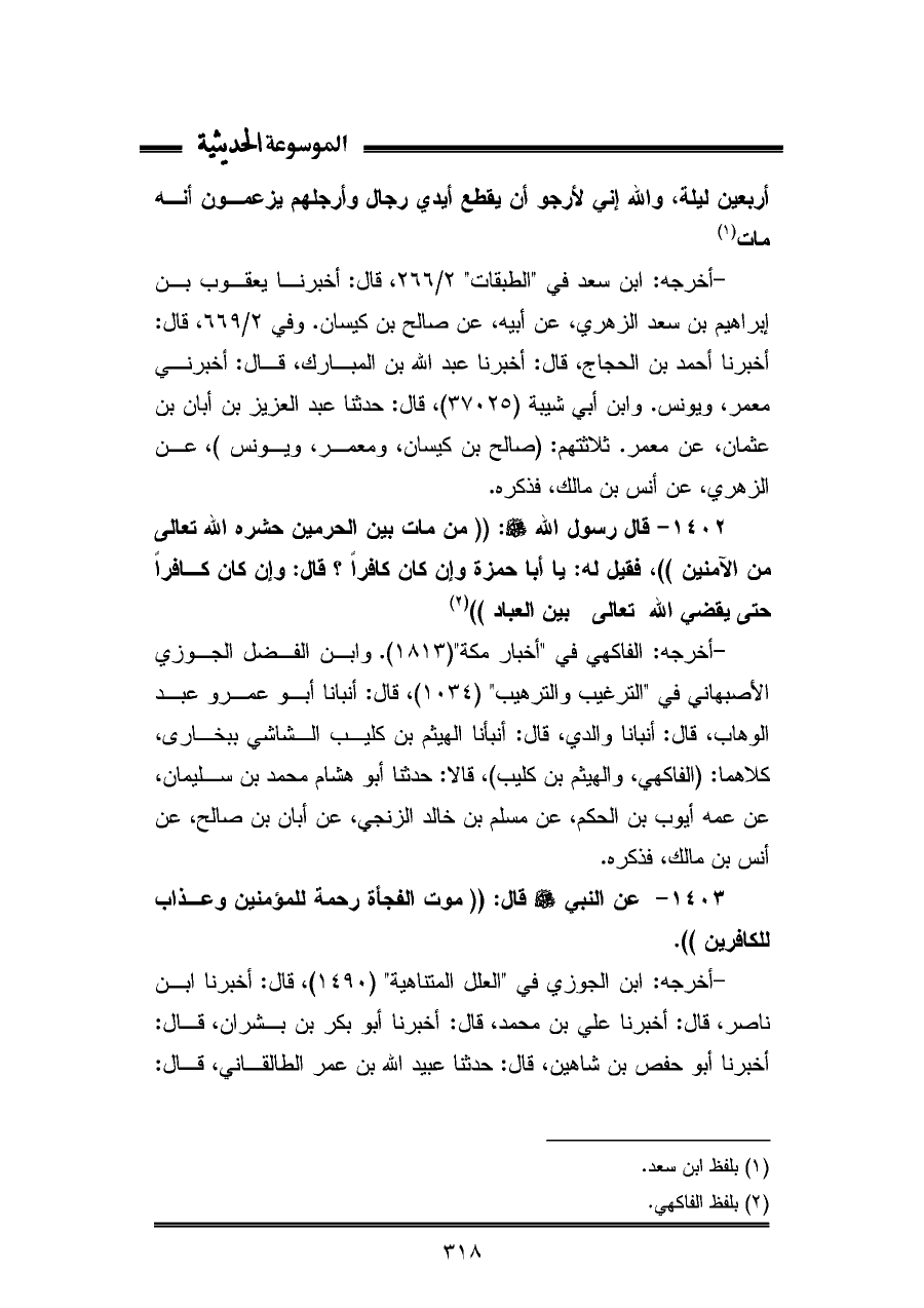 ١٤٠٣ - عن النبي - صلى الله عليه وسلم - قال: "موت الفجأة رحمة للمؤمنين وعذاب للكافرين".