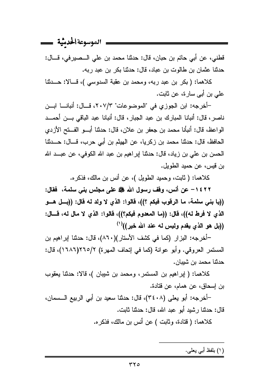 ١٤٢٢ - عن أنس، وقف رسول الله - صلى الله عليه وسلم - على مجلس بني سلمة، فقال: "يا بني سلمة، ما الرقوب فيكم؟ "، قالوا: الذي لا ولد له قال: "بل هو الذي لا فرط له"، قال: "ما المعدوم فيكم؟ "، قالوا: الذي لا مال له، قال: "بل هو الذي يقدم وليس له عند الله خير" (¬١)