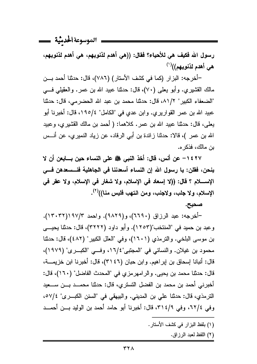١٤٢٧ - عن أنس، قال: أخذ النبي - صلى الله عليه وسلم - على النساء حين بايعن أن لا ينحن، فقلن: يا رسول الله إن النساء أسعدننا في الجاهلية فنسعدهن في الإسلام؟ قال: "لا إسعاد في الإسدم، ولا شغار في الإسدم، ولا عقر في الإسدم، ولا جلب، ولاجنب، ومن انتهب فليس منا" (¬٢).