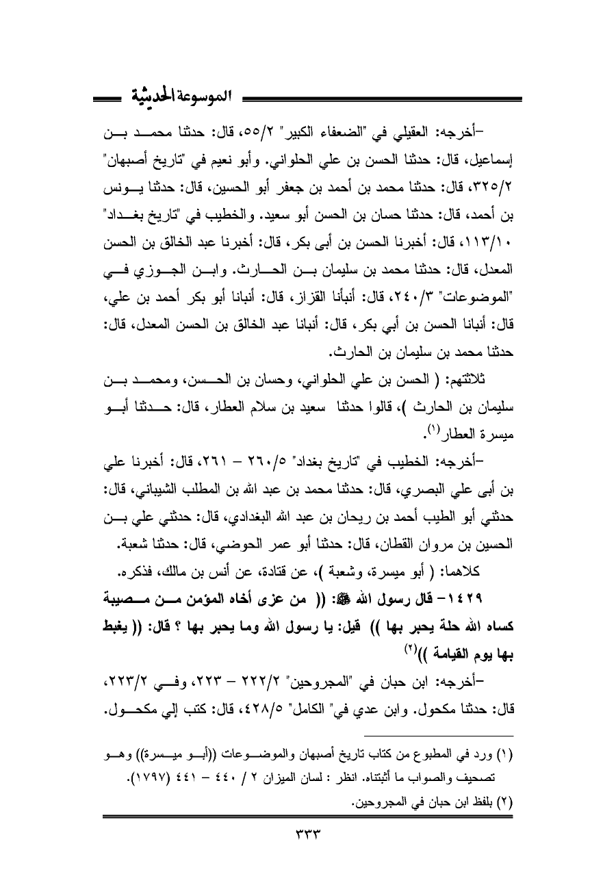 ثلاثتهم: (الحسن بن علي الحلواني، وحسان بن الحسن، ومحمد بن سليمان بن الحارث)، قالوا حدثنا سعيد بن سلام العطار، قال: حدثنا أبو ميسرة العطار (¬١).