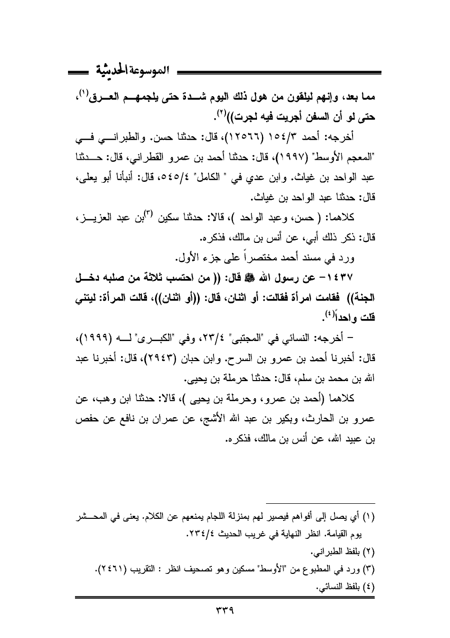 ١٤٣٧ - عن رسول الله - صلى الله عليه وسلم - قال: "من احتسب ثلاثة من صلبه دخل الجنة" فقامت امرأة فقالت: أو اثنان، قال: "أو اثنان"، قالت المرأة: ليتني قلت واحدًا (¬٤).