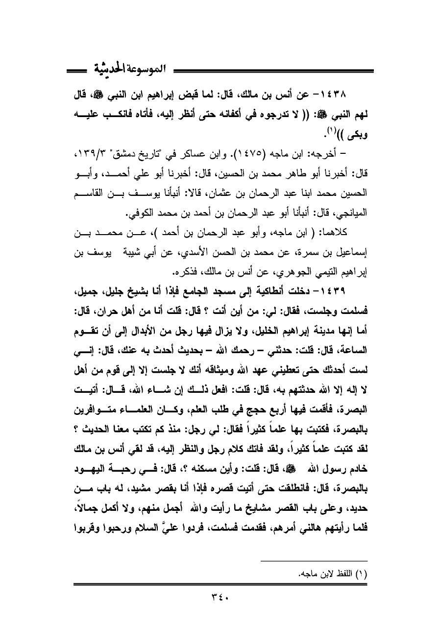 ١٤٣٩ - دخلت أنطاكية إلى مسجد الجامع فإذا أنا بشيخ جليل، جميل، فسلمت وجلست، فقال: لي: من أين أنت؟ قال: قلت أنا من أهل حران، قال: أما إنها مدينة إبراهيم الخليل، ولا يزال فيها رجل من الأبدال إلى أن تقوم الساعة، قال: قلت: حدثني - رحمك الله - بحديت أحدث به عنك، قال: إني لست أحدثك حتى تعطيني عهد الله وميثاقه أنك لا جلست إلا إلى قوم من أهل لا إله إلا الله حدثتهم به، قال: قلت: افعل ذلك إن شاء الله، قال: أتيت البصرة، فأقمت فيها أربع حجج في طلب العلم، وكان العلماء متوافرين بالبصرة، فكتبت بها علمًا كثيرًا فقال: لي رجل: منذ كم تكتب معنا الحديث؟ لقد كتبت علمًا كثيرًا، ولقد فاتك كلام رجل والنظر إليه، قد لقي أنس بن مالك خادم رسول الله - صلى الله عليه وسلم -، قال: قلت: وأين مسكنه؟، قال: في رحبة اليهود بالبصرة، قال: فانطلقت حتى أتيت قصره فإذا أنا بقصر مشيد، له باب من حديد، وعلى باب القصر مشايخ ما رأيت واللّه أجمل منهم، ولا أكمل جمالًا، فلما رأيتهم هالني أمرهم، فقدمت فسلمت، فردوا عليَّ السلام ورحبوا وقربوا
