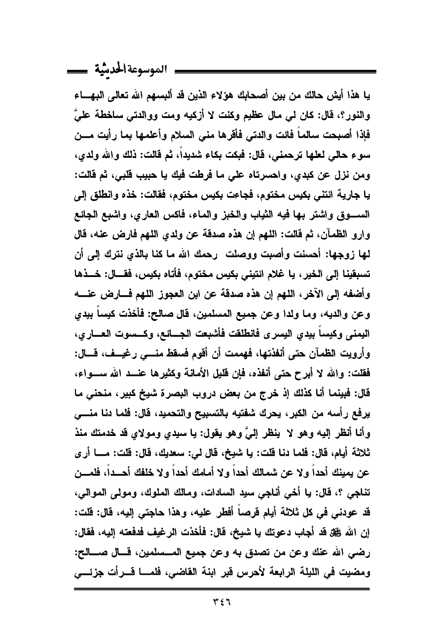 يا هذا أيش حالك من بين أصحابك هؤلاء الذين قد ألبسهم الله تعالى البهاء والنور؟، قال: كان لي مال عظيم وكنت لا أزكيه ومت ووالدتي ساخطة عليَّ فإذا أصبحت سالمًا فائت والدتي فأقرها مني السلام وأعلمها بما رأيت من سوء حالي لعلها ترحمني، قال: فبكت بكاء شديدًا، ثم قالت: ذلك واللّه ولدي، ومن نزل عن كبدي، واحسرتاه علي ما فرطت فيك يا حبيب قلبي، ثم قالت: يا جارية ائتني بكيس مختوم، فجاءت بكيس مختوم، فقالت: خذه وانطلق إلى السوق واشتر بها فيه الثياب والخبز والماء، فاكس العاري، واشبع الجائع وارو الظمآن، ثم قالت: اللهم إن هذه صدقة عن ولدي اللهم فارض عنه، قال لها زوجها: أحسنت وأصبت ووصلت رحمك الله ما كنا بالذي نترك إلى أن تسبقينا إلى الخير، يا غلام ائتيني بكيس مختوم، فأتاه بكيس، فقال: خذها وأضفه إلى الآخر، اللهم إن هذه صدقة عن ابن العجوز اللهم فارض عنه وعن والديه، وما ولدا وعن جميع المسلمين، قال صالح: فأخذت كيسًا بيدي اليمنى وكيسًا بيدي اليسرى فانطلقت فأشبعت الجائع، وكسوت العاري، وأرويت الظمآن حتى أنفذتها، فهممت أن أقوم فسقط مني رغيف، قال: فقلت: واللّه لا أبرح حتى أنفذه، فإن قليل الأمانة وكثيرها عند الله سواء، قال: فبينما أنا كذلك إذ خرج من بعض دروب البصرة شيخ كبير، منحني ما يرفع رأسه من الكبر، يحرك شفتيه بالتسبيح والتحميد، قال: فلما دنا مني وأنا أنظر إليه وهو لا ينظر إليَّ وهو يقول: يا سيدي ومولاي قد خدمتك منذ ثلاثة أيام، قال: فلما دنا قلت: يا شيخ، قال لي: سعديك، قال: قلت: ما أرى عن يمينك أحدًا ولا عن شمالك أحدًا ولا أمامك أحدًا ولا خلفك أحدًا، فلمن تناجي؟، قال: يا أخي أناجي سيد السادات، ومالك الملوك، ومولى الموالي، قد عودني في كل ثلاثة أيام قرصًا أفطر عليه، وهذا حاجتي إليه، قال: قلت: إن الله -عز وجل - قد أجاب دعوتك يا شيخ، قال: فأخذت الرغيف فدفعته إليه، فقال: رضي الله عنك وعن من تصدق به وعن جميع المسلمين، قال صالح: ومضيت في الليلة الرابعة لأحرس قبر ابنة القاضي، فلما قرأت جزئي