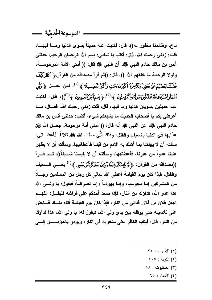 ناج، وظالمنا مغفور له"، قال: فكتبت عنه حديثًا يسوى الدنيا وما فيها، قلت: زدني رحمك الله، قال: أكتب يا شامي: بسم الله الرحمان الرحيم، حدثني أنس بن مالك خادم النبي - صلى الله عليه وسلم -، أن النبي - صلى الله عليه وسلم - قال: "أمتي الأمة المرحومة، ولولا الرحمة ما خلقهم الله"، قال: "ثم قرأ مصداقه من القرآن {انْظُرْ كَيْفَ فَضَّلْنَا بَعْضَهُمْ عَلَى بَعْضٍ وَلَلْآخِرَةُ أَكْبَرُ دَرَجَاتٍ وَأَكْبَرُ تَفْضِيلًا} (¬١)، لمن عمل {وَقُلِ اعْمَلُوا فَسَيَرَى اللَّهُ عَمَلَكُمْ وَرَسُولُهُ وَالْمُؤْمِنُونَ} {نِعْمَ أَجْرُ الْعَامِلِينَ} (¬٣) "، قال: فكتبت عنه حديثين يسويان الدنيا وما فيها، قال: قلت زدني رحمك الله، فقال: ما أعرفني بكم يا أصحاب الحديث ما يشبعكم شيء، أكتب: حدثني أنس بن مالك خادم النبي - صلى الله عليه وسلم -، عن النبي - صلى الله عليه وسلم - أنه قال: "أمتي أمة مرحومة، جعل الله.-عز وجل - عذابها في الدنيا بالسيف والقتل، وذلك أنِّي سألت الله.-عز وجل - ثلاثًا، فأعطاني، سألته أن لا يهلكنا بما أهلك به الأمم من قبلنا فأعطانيها، وسألته أن لا يظهر علينا عدوًا من غيرنا، فأعطانيها، وسألته أن لا يلبسنا شيئًا"، ثم قرأ "مصداقه من القرآن: {أَوْ يَلْبِسَكُمْ شِيَعًا وَيُذِيقَ بَعْضَكُمْ بَأْسَ بَعْضٍ} (¬٤) يعني السيف والقتل، فإذا كان يوم القيامة أعطى الله تعالى كل رجل من المسلمين رجلا من المشركين إما مجوسيًا، وإما يهوديًا وإما نصرانيًا، فيقول: يا ولي الله هذا عدو الله، فداؤك من النار، فإذا صعد أحدكم على فراشه فليقل: اللهم اجعل فلان بن فلان فدائي من النار، فإذا كان يوم القيامة أتاه ملك قابض على ناصيته حتى يوقفه بين يدي ولي الله، فيقول له: يا ولي الله، هذا فداؤك من النار، قال: فيكب الكافر على منخريه في النار، ويؤمر بالمؤمن إلى