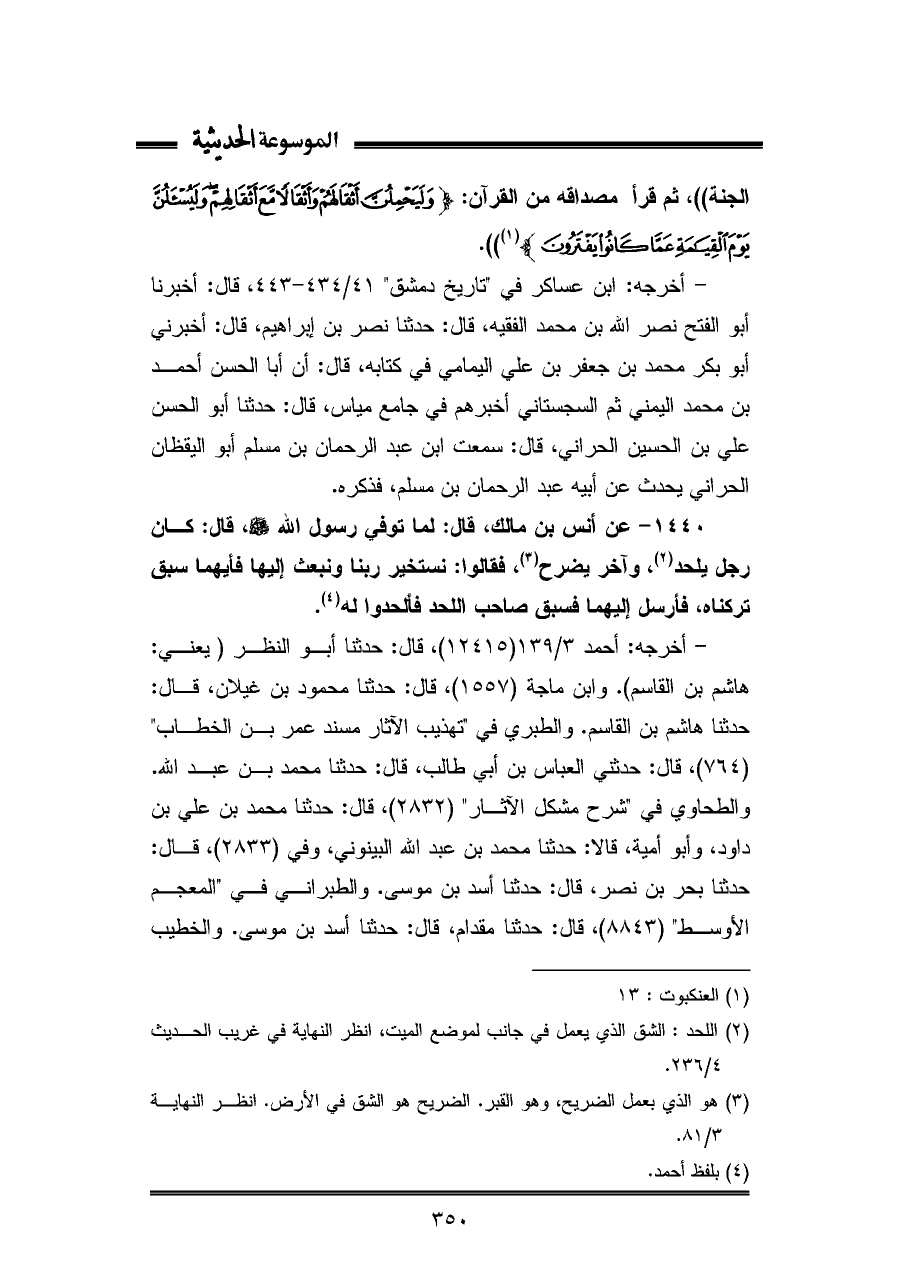 ١٤٤٠ - عن أنس بن مالك، قال: لما توفي رسول الله - صلى الله عليه وسلم -، قال: كان رجل يلحد (¬٢)، وآخر يضرح (¬٣)، فقالوا: نستخير ربنا ونبعث إليها فأيهما سبق تركناه، فأرسل إليهما فسبق صاحب اللحد فألحدوا له (¬٤).