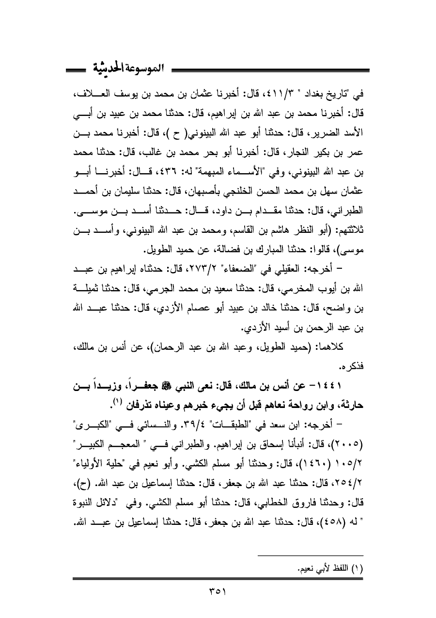 في "تاريخ بغداد" ٣/ ٤١١، قال: أخبرنا عثمان بن محمد بن يوسف العلاف، قال: أخبرنا محمد بن عبد الله بن إبراهيم، قال: حدثنا محمد بن عبيد بن أبي الأسد الضرير، قال: حدثنا أبو عبد الله البينوني (ح)، قال: أخبرنا محمد بن عمر بن بكير النجار، قال: أخبرنا أبو بحر محمد بن غالب، قال: حدثنا محمد بن عبد الله البينوني، وفي "الأسماء المبهمة" له: ٤٣٦، قال: أخبرنا أبو عثمان سهل بن محمد الحسن الخلنجي بأصبهان، قال: حدثنا سليمان بن أحمد الطبراني، قال: حدثنا مقدام بن داود، قال: حدثنا أسد بن موسى. ثلاثتهم: (أبو النظر هاشم بن القاسم، ومحمد بن عبد الله البينوني، وأسد بن موسى)، قالوا: حدثنا المبارك بن فضالة، عن حميد الطويل.