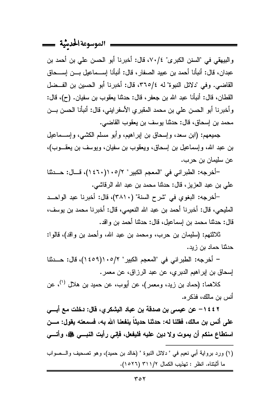 ١٤٤٢ - عن عيسى بن صدقة بن عباد اليشكري، قال: دخلت مع أبي على أنس بن مالك، فقلنا له: حدثنا حديثًا ينفعنا الله به، فسمعته يقول: من استطاع منكم أن يموت ولا دين عليه فليفعل، فإني رأيت النبي - صلى الله عليه وسلم -، وأتي