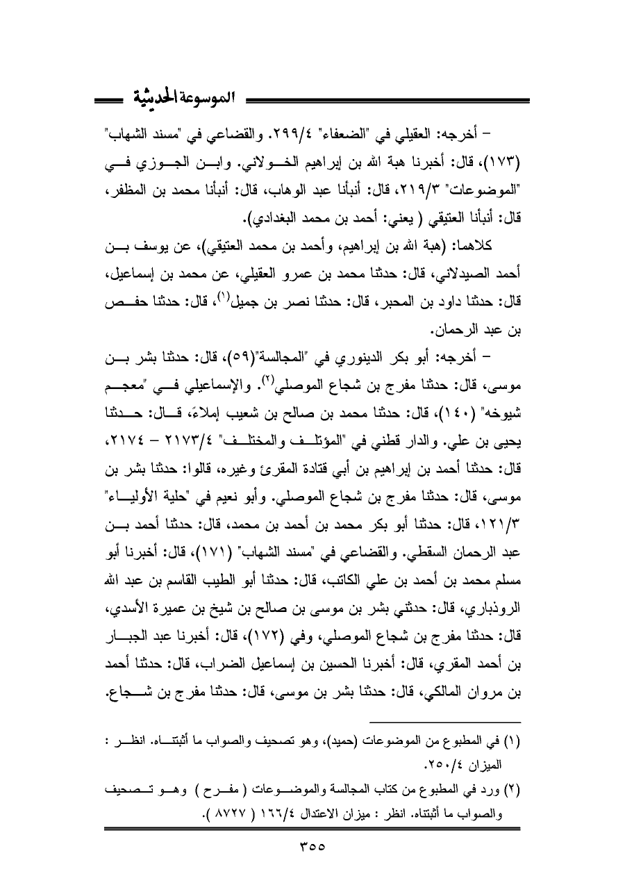 - أخرجه: أبو بكر الدينوري في "المجالسة" (٥٩)، قال: حدثنا بشر بن موسى، قال: حدثنا مفرج بن شجاع الموصلي (¬٢). والإسماعيلي في "معجم شيوخه" (١٤٠)، قال: حدثنا محمد بن صالح بن شعيب إملاءً، قال: حدثنا يحيى بن علي. والدارقطني في "المؤتلف والمختلف" ٤/ ٢١٧٣ - ٢١٧٤، قال: حدثنا أحمد بن إبراهيم بن أبي قتادة المقرئ وغيره، قالوا: حدثنا بشر بن موسى، قال: حدثنا مفرج بن شجاع الموصلي. وأبو نعيم في "حلية الأولياء" ٣/ ١٢١، قال: حدثنا أبو بكر محمد بن أحمد بن محمد، قال: حدثنا أحمد بن عبد الرحمان السقطي. والقضاعي في "مسند الشهاب" (١٧١)، قال: أخبرنا أبو مسلم محمد بن أحمد بن علي الكاتب، قال: حدثنا أبو الطيب القاسم بن عبد الله الروذباري، قال: حدثني بشر بن موسى بن صالح بن شيخ بن عميرة الأسدي، قال: حدثنا مفرج بن شجاع الموصلي، وفي (١٧٢)، قال: أخبرنا عبد الجبار بن أحمد المقري، قال: أخبرنا الحسين بن إسماعيل الضراب، قال: حدثنا أحمد بن مروان المالكي، قال: حدثنا بشر بن موسى، قال: حدثنا مفرج بن شجاع.
