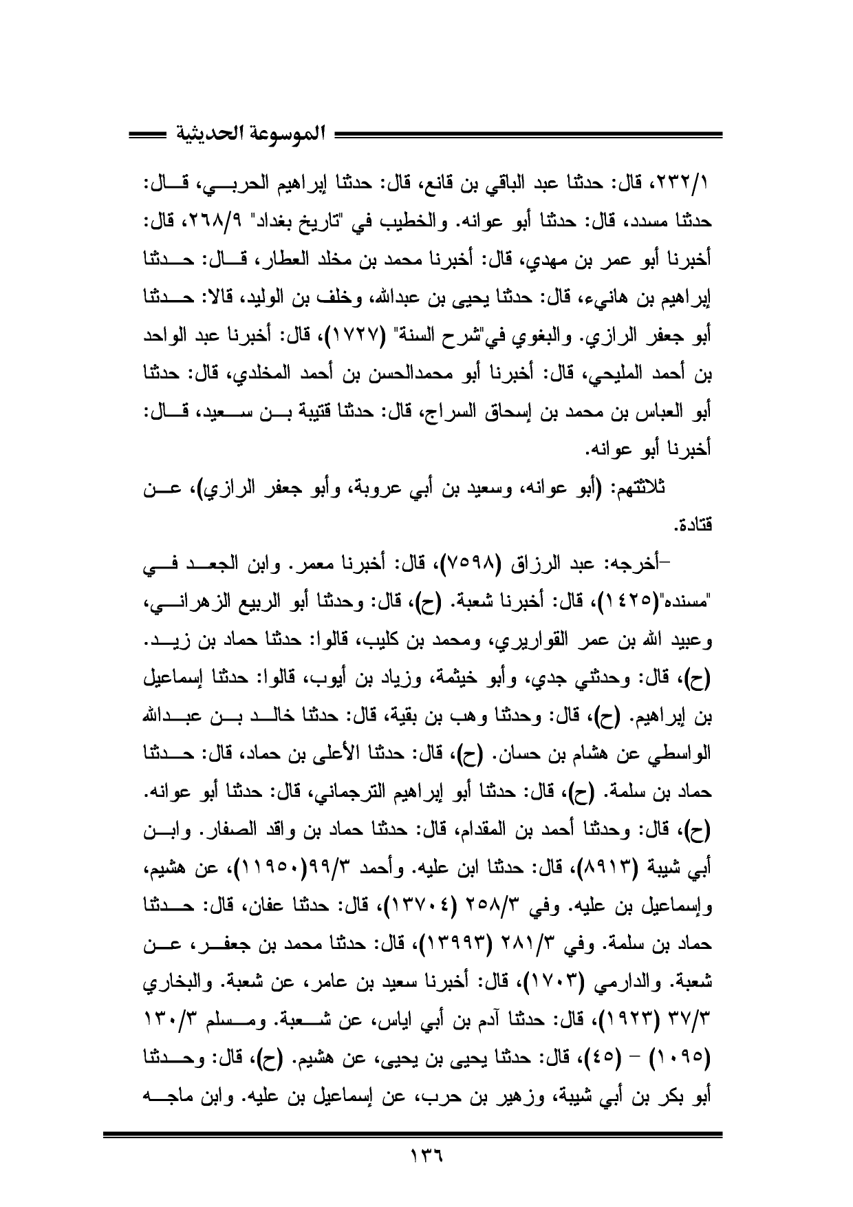 ١/ -٢٣٢، قال: حدثنا عبد الباقي بن قانع، قال: حدثنا إبراهيم الحربي، قال: حدثنا مسدد، قال: حدثنا أبو عوانه. والخطيب في "تاريخ بغداد" ٩/ ٢٦٨، قال: أخبرنا أبو عمر بن مهدي، قال: أخبرنا محمد بن مخلد العطار، قال: حدثنا إبراهيم بن هانيء، قال: حدثنا يحيى بن عبد الله، وخلص بن الوليد، قالا: حدثنا أبو جعفر الرازي. والبغوي في "شرح السنة" (١٧٢٧)، قال: أخبرنا عبد الواحد بن أحمد المليحي، قال: أخبرنا أبو محمد الحسن بن أحمد المخلدى، قال: حدثنا أبو العباس بن محمد بن إسحاق السراج، قال: حدثنا قتيبة بن سعيد، قال: أخبرنا أبو عوانه.