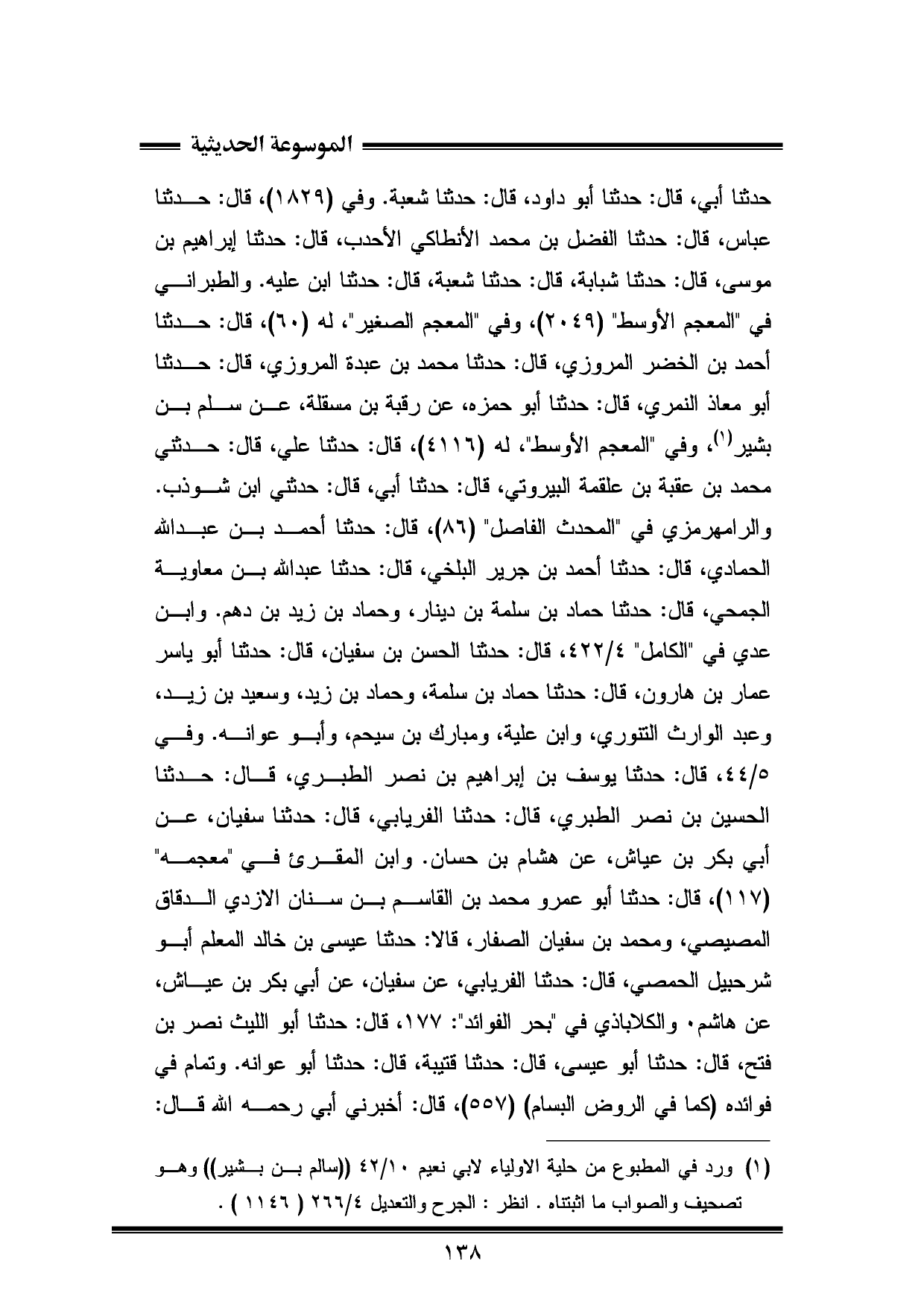 حدثنا أبي، قال: حدثنا أبو داود، قال: حدثنا شعبة. وفي (١٨٢٩)، قال: حدثنا عباس، قال: حدثنا الفضل بن محمد الأنطاكي الأحدب، قال: حدثنا إبراهيم بن موسى، قال: حدثنا شبابة، قال: حدثنا شعبة، قال: حدثنا ابن عليه. والطبراني في "المعجم الأوسط" (٢٠٤٩)، وفي "المعجم الصغير"، له (٦٠)، قال: حدثنا أحمد بن الخضر المروزي، قال: حدثنا محمد بن عبدة المروزي، قال: حدثنا أبو معاذ النمري، قال: حدثنا أبو حمزه، عن رقبة بن مسقلة، عن سلم بن بشير (¬١)، وفي "المعجم الأوسط"، له (٤١١٦)، قال: حدثنا علي، قال: حدثني محمد بن عقبة بن علقمة البيروتي، قال: حدثنا أبي، قال: حدثني ابن شوذب. والرامهرمزي في "المحدث الفاصل" (٨٦)، قال: حدثنا أحمد بن عبد الله الحمادي، قال: حدثنا أحمد بن جرير البلخي، قال: حدثنا عبد الله بن معاوية الجمحي، قال: حدثنا حماد بن سلمة بن دينار، وحماد بن زيد بن دهم. وابن عدي في "الكامل" ٤/ ٤٢٢، قال: حدثنا الحسن بن سفيان، قال: حدثنا أبو ياسر عمار بن هارون، قال: حدثنا حماد بن سلمة، وحماد بن زيد، وسعيد بن زيد، وعبد الوارث التنوري، وابن علية، ومبارك بن سيحم، وأبو عوانه. وفي ٥/ ٤٤، قال: حدثنا يوسف بن إبراهيم بن نصر الطبري، قال: حدثنا الحسين بن نصر الطبري، قال: حدثنا الفريابي، قال: حدثنا سفيان، عن أبي بكر بن عياش، عن هشام بن حسان. وابن المقرئ في "معجمه" (١١٧)، قال: حدثنا أبو عمرو محمد بن القاسم بن سنان الأزدي الدقاق المصيصي، ومحمد بن سفيان الصفار، قالا: حدثنا عيسى بن خالد المعلم أبو شرحبيل الحمصي، قال: حدثنا الفريابي، عن سفيان، عن أبي بكر بن عياش، عن هاشم. والكلاباذي في "بحر الفوائد": ١٧٧، قال: حدثنا أبو الليث نصر بن فتح، قال: حدثنا أبو عيسى، قال: حدثنا قتيبة، قال: حدثنا أبو عوانه. وتمام في فوائده (كما في الروض البسام) (٥٥٧)، قال: أخبرني أبي رحمه الله قال:
