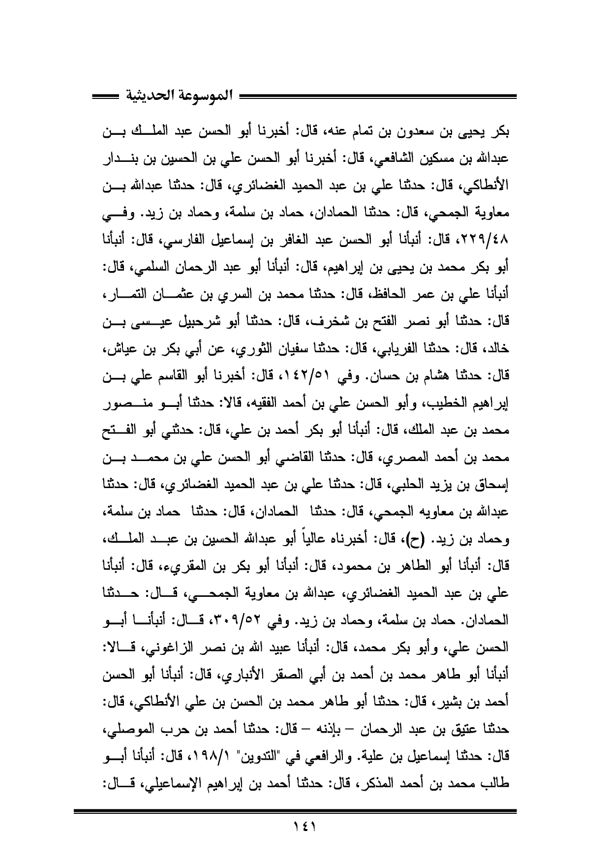 بكر يحيى بن سعدون بن تمام عنه، قال: أخبرنا أبو الحسن عبد الملك بن عبد الله بن مسكين الشافعي، قال: أخبرنا أبو الحسن على بن الحسين بن بندار الأنطاكي، قال: حدثنا على بن عبد الحميد الغضائري، قال: حدثنا عبد الله بن معاوية الجمحي، قال: حدثنا الحمادان، حماد بن سلمة، وحماد بن زيد. وفي ٤٨/ ٢٢٩، قال: أنبأنا أبو الحسن عبد الغافر بن إسماعيل الفارسي، قال: أنبأنا أبو بكر محمد بن يحيى بن إبراهيم، قال: أنبأنا أبو عبد الرحمان السلمي، قال: أنبأنا علي بن عمر الحافظ، قال: حدثنا محمد بن السري بن عثمان التمار، قال: حدثنا أبو نصر الفتح بن شخرف، قال: حدثنا أبو شرحبيل عيسى بن خالد، قال: حدثنا الفريابي، قال: حدثنا سفيان الثوري، عن أبي بكر بن عياش، قال: حدثنا هشام بن حسان. وفي ٥١/ ١٤٢، قال: أخبرنا أبو القاسم علي بن إبراهيم الخطيب، وأبو الحسن علي بن أحمد الفقيه، قالا: حدثنا أبو منصور محمد بن عبد الملك، قال: أنبأنا أبو بكر أحمد بن علي، قال: حدثنى أبو الفتح محمد بن أحمد المصري، قال: حدثنا القاضي أبو الحسن على بن محمد بن إسحاق بن يزيد الحلبي، قال: حدثنا علي بن عبد الحميد الغضائري، قال: حدثنا عبد الله بن معاويه الجمحي، قال: حدثنا الحمادان، قال: حدثنا حماد بن سلمة، وحماد بن زيد. (ح)، قال: أخبرناه عاليًا أبو عبد الله الحسين بن عبد الملك، قال: أنبأنا أبو الطاهر بن محمود، قال: أنبأنا أبو بكر بن المقريء، قال: أنبأنا علي بن عبد الحميد الغضائري، عبد الله بن معاوية الجمحي، قال: حدثنا الحمادان. حماد بن سلمة، وحماد بن زيد. وفي ٥٢/ ٣٠٩، قال: أنبأنا أبو الحسن علي، وأبو بكر محمد، قال: أنبأنا عبيد الله بن نصر الزاغوني، قالا: أنبأنا أبو طاهر محمد بن أحمد بن أبي الصقر الأنباري، قال: أنبأنا أبو الحسن أحمد بن بشير، قال: حدثنا أبو طاهر محمد بن الحسن بن على الأنطاكي، قال: حدثنا عتيق بن عبد الرحمان - بإذنه - قال: حدثنا أحمد بن حرب الموصلي، قال: حدثنا إسماعيل بن علية. والرافعي في "التدوين" ١/ ١٩٨، قال: أنبأنا أبو طالب محمد بن أحمد المذكر، قال: حدثنا أحمد بن إبراهيم الإسماعيلي، قال: