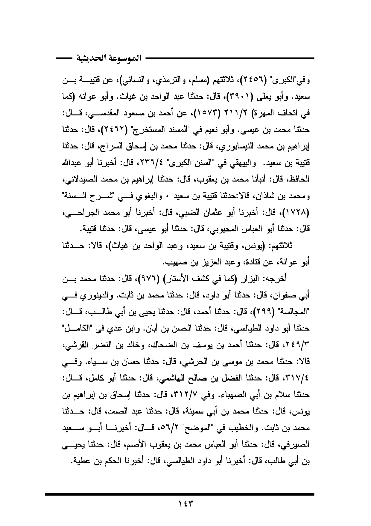 وفي "الكبرى" (٢٤٥٦)، ثلاثتهم (مسلم، والترمذي، والنسائي)، عن قتيبة بن سعيد. وأبو يعلى (٣٩٠١)، قال: حدثنا عبد الواحد بن غياث. وأبو عوانه (كما في إتحاف المهرة) ٢/ ٢١١ (١٥٧٣)، عن أحمد بن مسعود المقدسي، قال: حدثنا محمد بن عيسى. وأبو نعيم في "المسند المستخرج" (٢٤٦٢)، قال: حدثنا إبراهيم بن محمد النيسابوري، قال: حدثنا محمد بن إسحاق السراج، قال: حدثنا قتيبة بن سعيد. والبيهقي في "السنن الكبرى" ٤/ ٢٣٦، قال: أخبرنا أبو عبد الله الحافظ، قال: أنبأنا محمد بن يعقوب، قال: حدثنا إبراهيم بن محمد الصيدلاني، ومحمد بن شاذان، قالا: حدثنا قتيبة بن سعيد. والبغوي في "شرح السنة" (١٧٢٨)، قال: أخبرنا أبو عثمان الضبي، قال: أخبرنا أبو محمد الجراحي، قال: حدثنا أبو العباس المحبوبي، قال: حدثنا أبو عيسى، قال: حدثنا قتيبة.