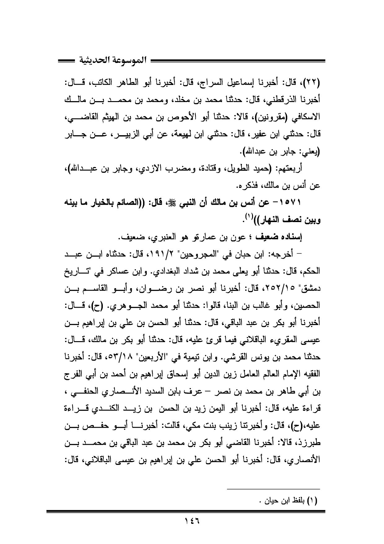 (٢٢)، قال: أخبرنا إسماعيل السراج، قال: أخبرنا أبو الطاهر الكلاب، قال: أخبرنا الدرقطني، قال: حدثنا محمد بن مخلد، ومحمد بن محمد بن مالك الاسكافي (مقرونين)، قالا: حدثنا أبو الأحوص بن محمد بن الهيثم القاضي، قال: حدثني ابن عفير، قال: حدثني ابن لهيعة، عن أبي الزبير، عن جابر (يعني: جابر بن عبد الله).
