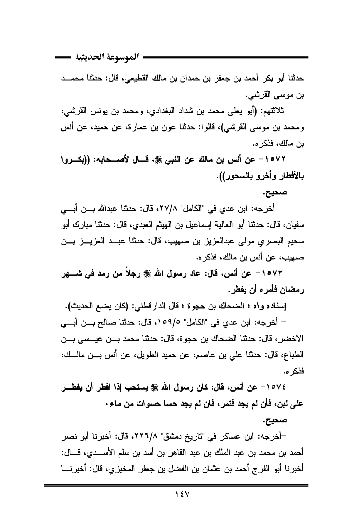 ١٥٧٢ - عن أنس بن مالك عن النبي - صلى الله عليه وسلم -، قال لأصحابه: "بكروا بالأفطار وأخرو بالسحور".