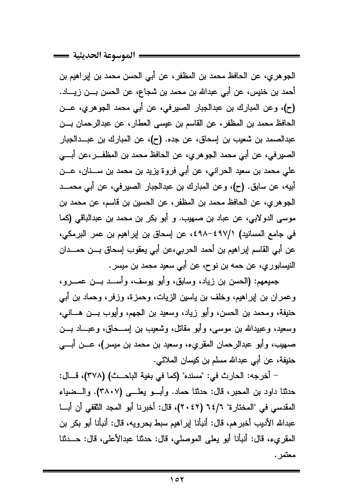 الجوهري، عن الحافظ محمد بن المظفر، عن أبي الحسن محمد بن إبراهيم بن أحمد بن خنيس، عن أبي عبد الله بن محمد بن شجاع، عن الحسن بن زياد. (ح)، وعن المبارك بن عبد الجبار الصيرفي، عن أبي محمد الجوهري، عن الحافظ محمد بن المظفر، عن القاسم بن عيسى العطار، عن عبد الرحمان بن عبد الصمد بن شعيب بن إسحاق، عن جده. (ح)، عن المبارك بن عبد الجبار الصيرفي، عن أبي محمد الجوهري، عن الحافظ محمد بن المظفر، عن أبي علي محمد بن سعيد الحراني، عن أبي فروة يزيد بن محمد بن سنان، عن أبيه، عن سابق. (ح)، وعن المبارك بن عبد الجبار الصيرفي، عن أبي محمد الجوهري، عن الحافظ محمد بن المظفر، عن الحسين بن قاسم، عن محمد بن موسى الدولابي، عن عباد بن صهيب. وأبو بكر بن محمد بن عبد الباقي (كما في جامع المسانيد) ١/ ٤٩٧ - ٤٩٨، عن إسحاق بن إبراهيم بن عمر البرمكي، عن أبي القاسم إبراهيم بن أحمد الحربي، عن أبي يعقوب إسحاق بن حمدان النيسابوري، عن حمه بن نوح، عن أبي سعيد محمد بن ميسر.