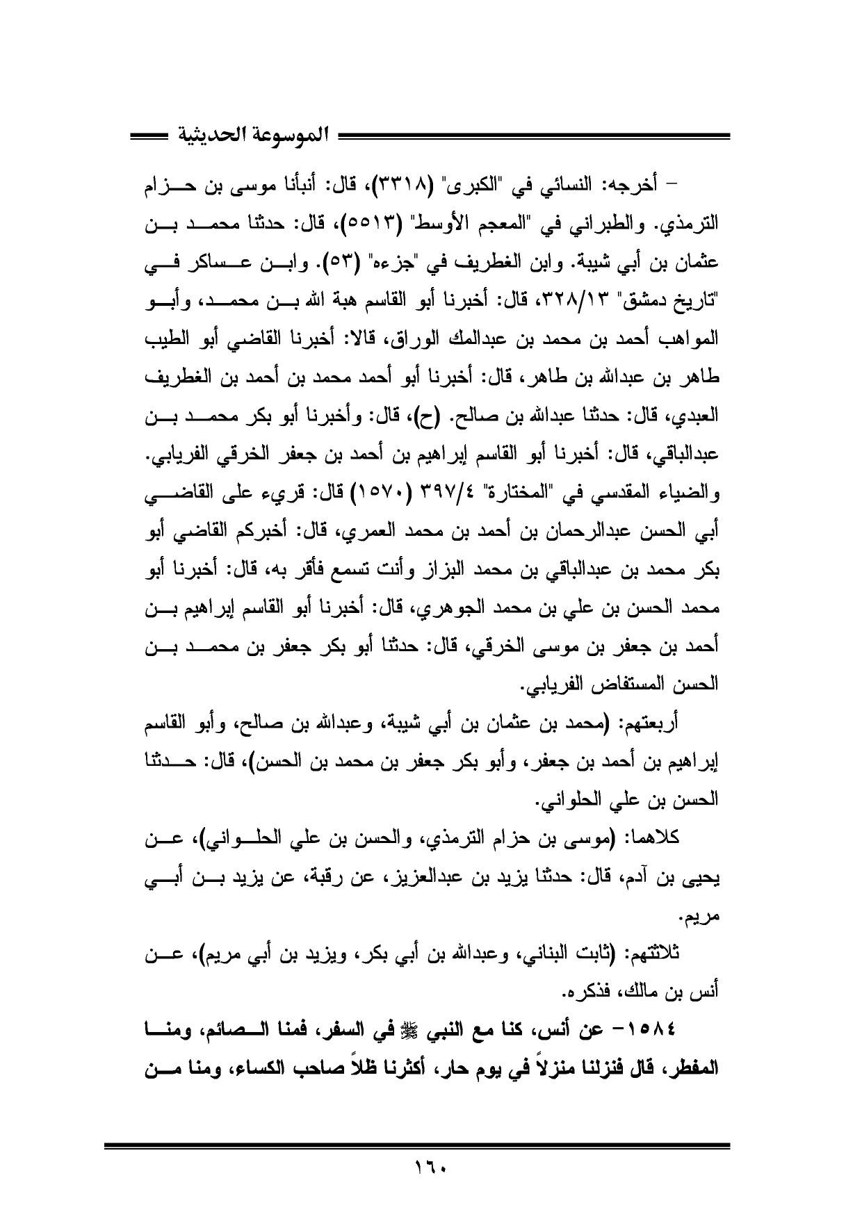 ١٥٨٤ - عن أنس، كنا مع النبي - صلى الله عليه وسلم - في السفر، فمنا الصائم، ومنا المفطر، قال فنزلنا منزلًا في يوم حار، أكثرنا ظلًا صاحب لكساء، ومنا من