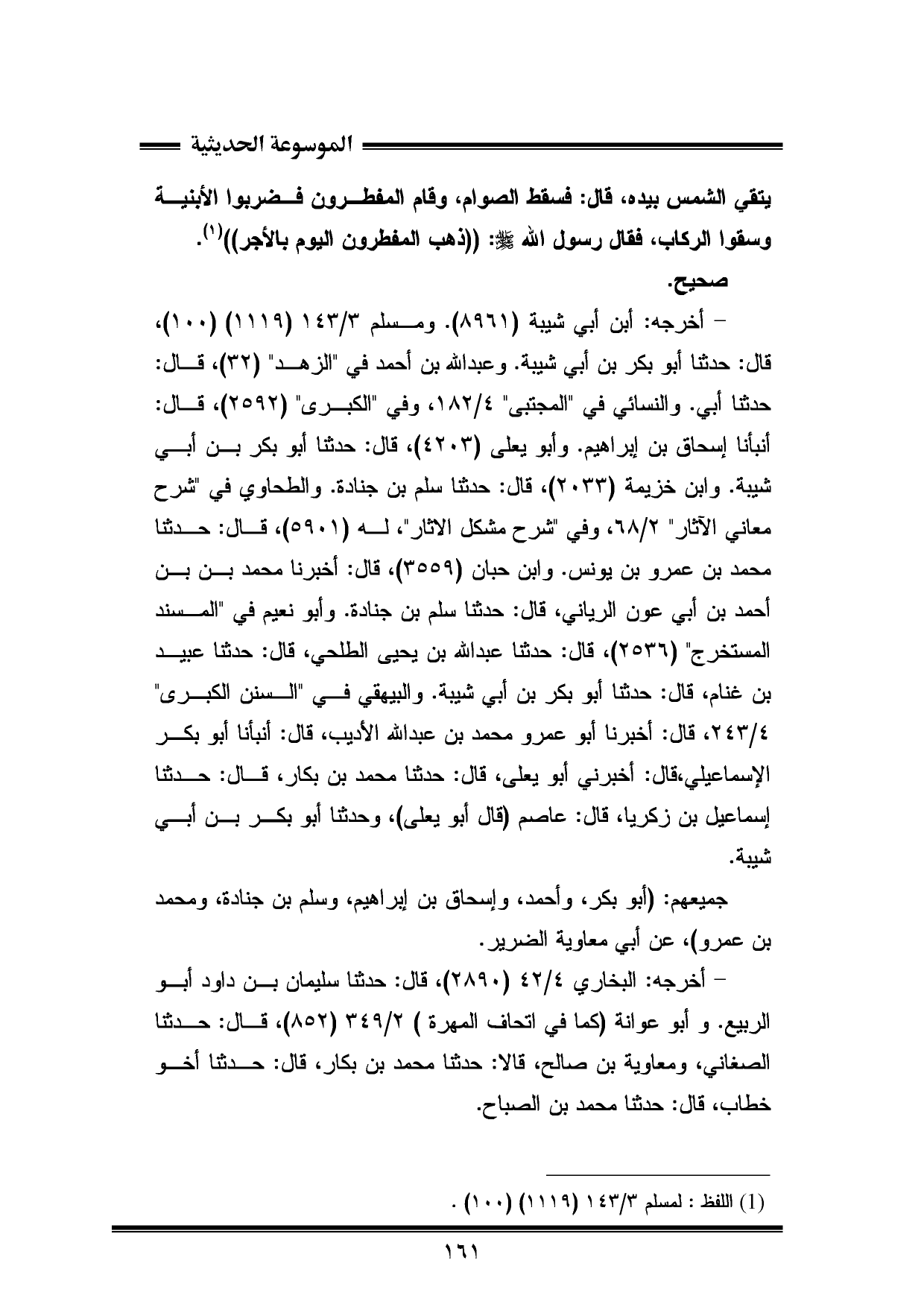 - أخرجه: ابن أبي شيبة (٨٩٦١). ومسلم ٣/ ١٤٣ (١١١٩) (١٠٠)، قال: حدثنا أبو بكر بن أبي شيبة. وعبد الله بن أحمد في "الزهد" (٣٢)، قال: حدثنا أبي. والنسائي في "المجتبى" ٤/ ١٨٢، وفي "الكبرى" (٢٥٩٢)، قال: أنبأنا إسحاق بن إبراهيم. وأبو يعلى (٤٢٠٣)، قال: حدثنا أبو بكر بن أبي شيبة. وابن خزيمة (٢٠٣٣)، قال: حدثنا سلم بن جنادة. والطحاوي في "شرح معاني الآثار" ٢/ ٦٨، وفي "شرح مشكل الآثار"، له (٥٩٠١)، قال: حدثنا محمد بن عمرو بن يونس. وابن حبان (٣٥٥٩)، قال: أخبرنا محمد بن بن أحمد بن أبي عون الرياني، قال: حدثنا سلم بن جنادة. وأبو نعيم في "المسند المستخرج" (٢٥٣٦)، قال: حدثنا عبد الله بن يحيى الطلحي، قال: حدثنا عبيد بن غنام، قال: حدثنا أبو بكر بن أبي شيبة. والبيهقي في "السنن الكبرى" ٤/ ٢٤٣، قال: أخبرنا أبو عمرو محمد بن عبد الله الأديب، قال: أنبأنا أبو بكر الإسماعيلي، قال: أخبرني أبو يعلى، قال: حدثنا محمد بن بكار، قال: حدثنا إسماعيل بن زكريا، قال: عاصم (قال أبو يعلى)، وحدثنا أبو بكر بن أبي شيبة.