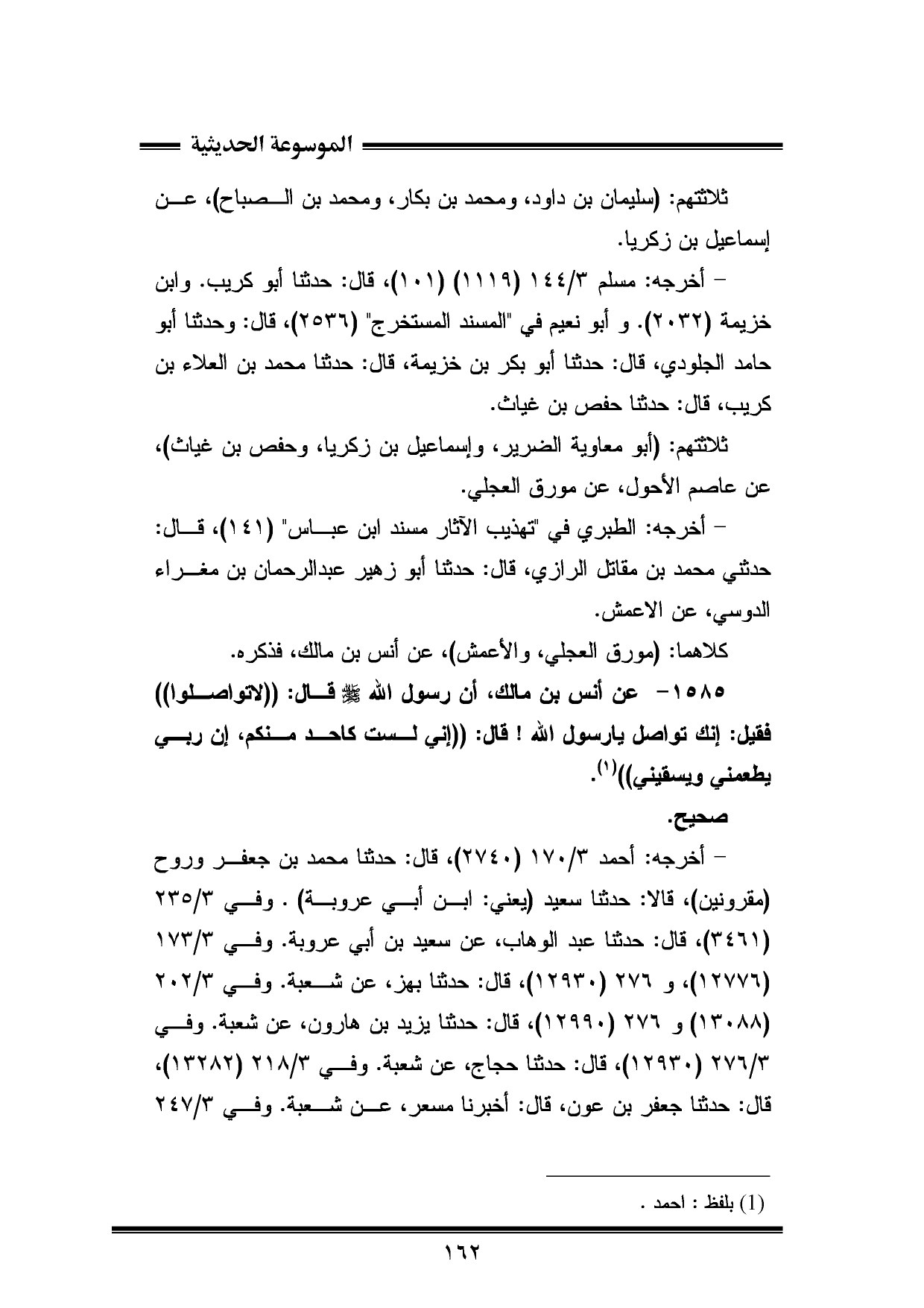 ثلاثتهم: (سليمان بن داود، ومحمد بن بكار، ومحمد بن الصباح)، عن إسماعيل بن زكريا.