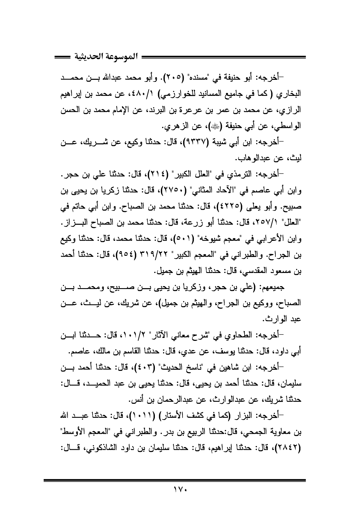 - أخرجه: أبو حنيفة في "مسنده" (٢٠٥). وأبو محمد عبد الله بن محمد البخاري (كما في جاميع المسانيد للخوارزمي) ١/ ٤٨٠، عن محمد بن إبراهيم الرازي، عن محمد بن عمر بن عرعرة بن البرند، عن الإمام محمد بن الحسن الواسطي، عن أبي حنيفة (- رضي الله عنه -)، عن الزهري.