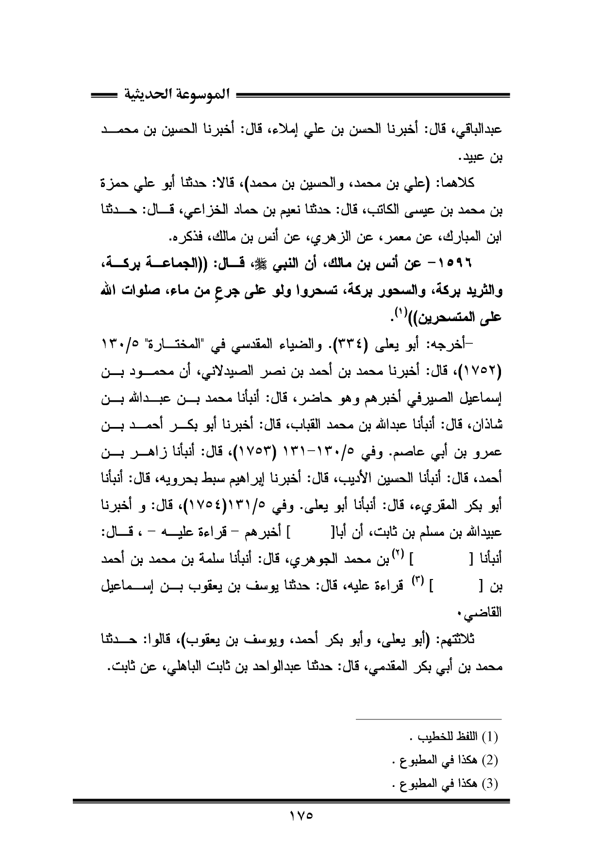 ١٥٩٦ - عن أنس بن مالك، أن النبي - صلي الله عليه ويلم -، قال: "الجماعة بركة، والثريد بركة، والسحور بركة، تسحروا ولو على جرعٍ من ماء، صلوات الله على المتسحرين" (¬١).