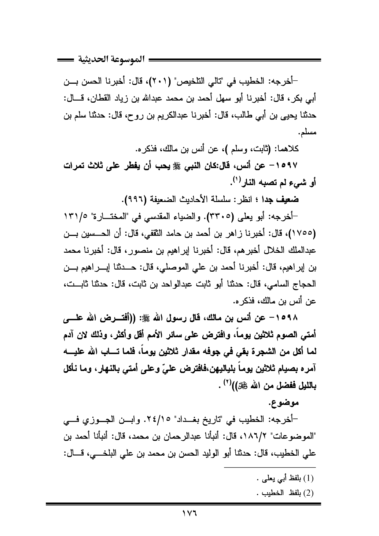١٥٩٨ - عن أنس بن مالك، قال رسول الله - صلى الله عليه وسلم -: "أَفترض الله على أمتى لصوم ثلاثين يومًا، وافترض على سائر الأمم أقل وأَكثر، وذلك لأن آدم لما أكل من الشجرة بقى في جوفه مقدار ثلاثين يومًا، فلما تاب الله عليه آمره بصيام ثلاثين يومًا بلياليهن، فافترض عليّ وعلى أمتي بالنهار، وما نأكل بالليل ففضل من الله - عز وجل - " (¬٢).