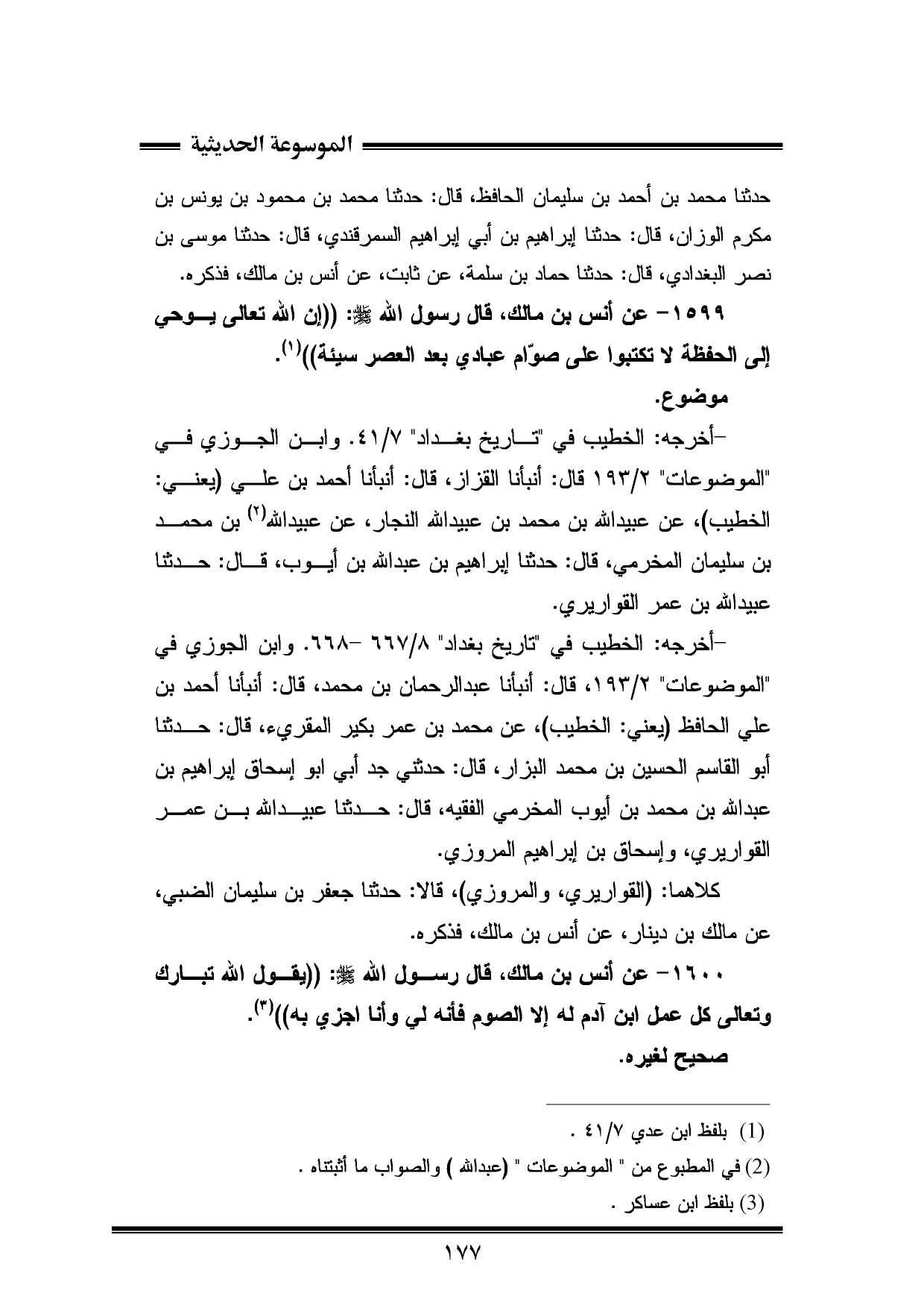 ١٥٩٩ - عن أنس بن مالك، قال رسول الله - صلي الله عليه وسلم -: "إن الله تعالى يوحى إلى الحفظة لا تكتبوا على صوّام عبادي بعد العصر سيئة" (¬١).