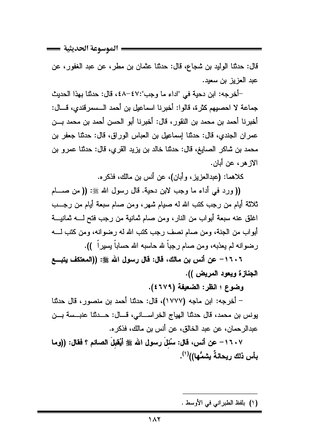 - أخرجه: ابن دحية في "أداء ما وجب":٤٧ - ٤٨، قال: حدثنا بهذا الحديث جماعة لا أحصيهم كثرة، قالوا: أخبرنا إسماعيل بن أحمد السمرقندي، قال: أخبرنا أحمد بن محمد بن النقور، قال: أخبرنا أبو الحسن أحمد بن محمد بن عمران الجندي، قال: حدثنا إسماعيل بن العباس الوراق، قال: حدثنا جعفر بن محمد بن شاكر الصايغ، قال: حدثنا خالد بن يزيد القري، قال: حدثنا عمرو بن الأزهر، عن أبان.