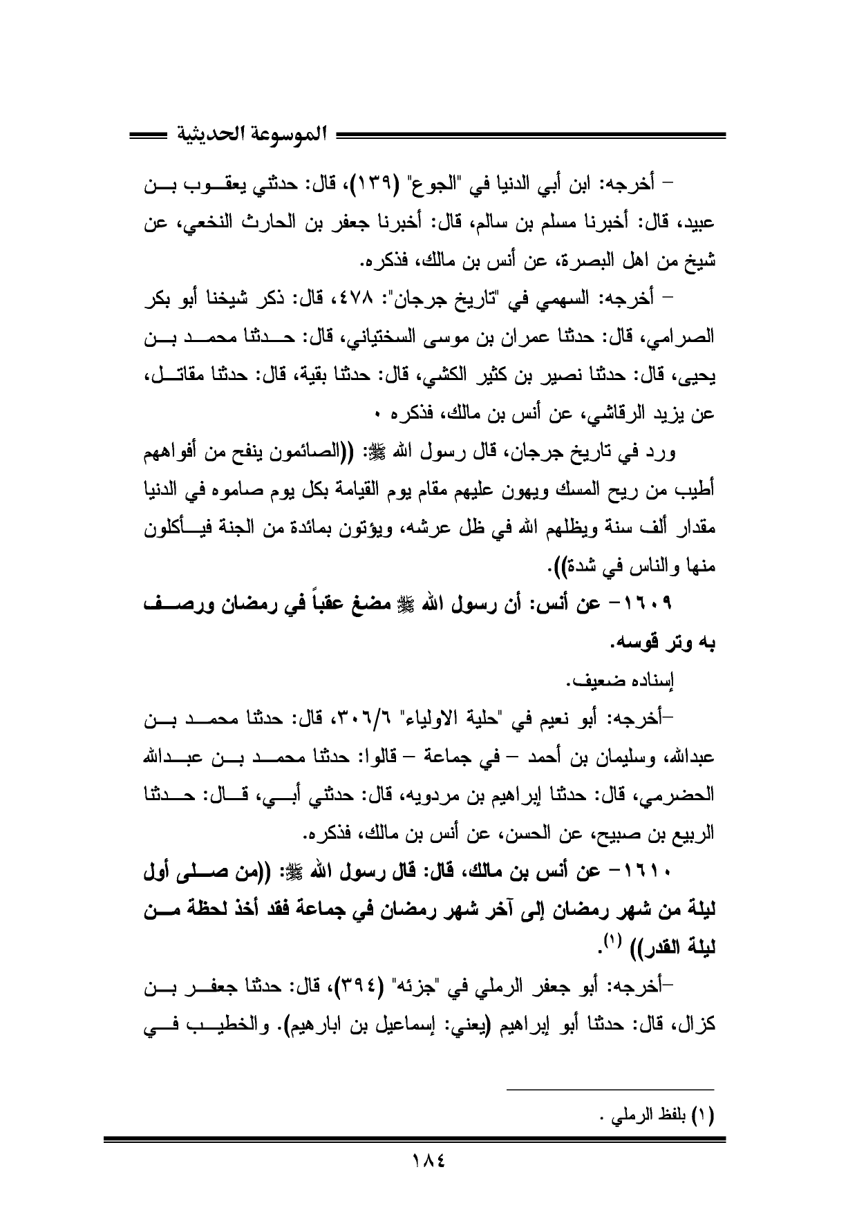 ١٦١٠ - عن أنس بن مالك، قال: قال رسول الله - صلى الله عليه وسلم -: "من صلى أول ليلة من شهر رمضان بى أخر شهر رمضان في جماعة فقد أخذ لحظة من ليلة القدر" (¬١).