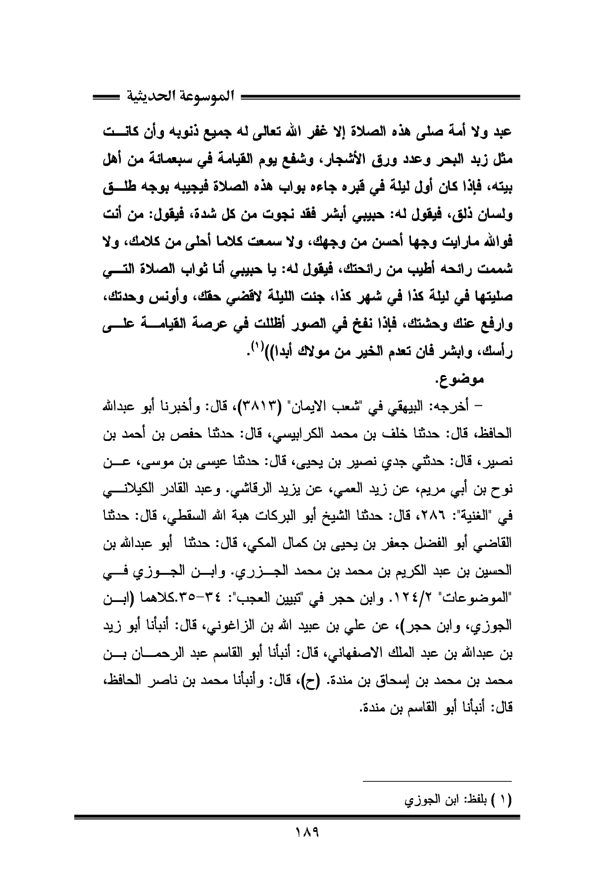 - أخرجه: البيهقي في "شعب الإيمان" (٣٨١٣)، قال: وأخبرنا أبو عبد الله الحافظ، قال: حدثنا خلف بن محمد الكرابيسى، قال: حدثنا حفص بن أحمد بن نصير، قال: حدثني جدي نصير بن يحيى، قال: حدثنا عيسى بن موسى، عن نوح بن أبي مريم، عن زيد العمي، عن يزيد الرقاشي. وعبد القادر الكيلاني في "الغنية": ٢٨٦، قال: حدثنا الشيخ أبو البركات هبة الله السقطي، قال: حدثنا القاضي أبو الفضل جعفر بن يحيى بن كمال المكي، قال: حدثنا أبو عبد الله بن الحسين بن عبد الكريم بن محمد بن محمد الجزري. وابن الجوزي في "الموضوعات" ٢/ ١٢٤. وابن حجر في "تبيين العجب": ٣٤ - ٣٥. كلاهما (ابن الجوزي، وابن حجر)، عن علي بن عبيد الله بن الزاغوني، قال: أنبأنا أبو زيد بن عبد الله بن عبد الملك الاصفهاني، قال: أنبأنا أبو القاسم عبد الرحمان بن محمد بن محمد بن إسحاق بن مندة. (ح)، قال: وأنبأنا محمد بن ناصر الحافظ، قال: أنبأنا أبو القاسم بن مندة.