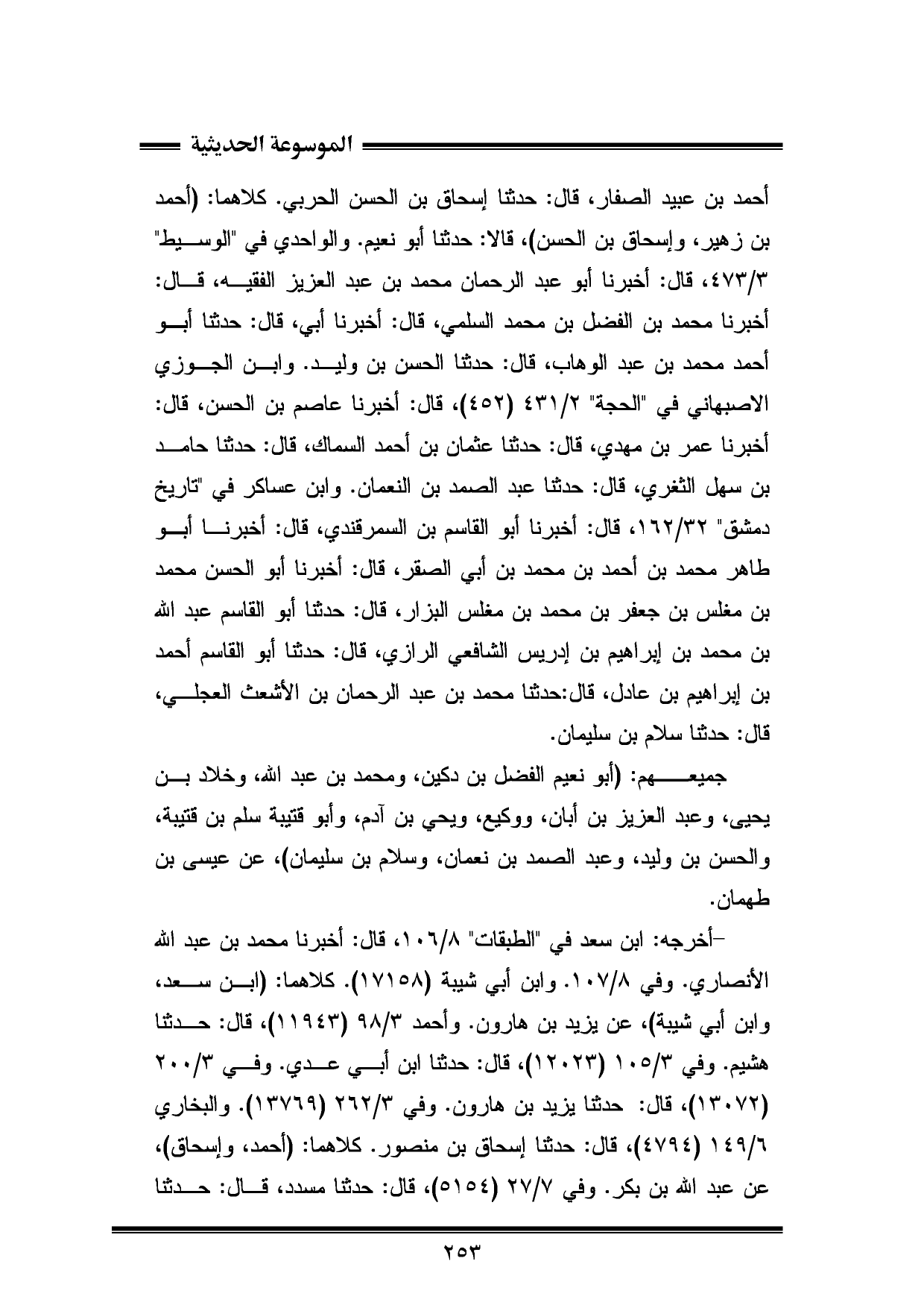 أحمد بن عبيد الصفار، قال: حدثنا إسحاق بن الحسن الحربي. كلاهما: (أحمد بن زهير، وإسحاق بن الحسن)، قالا: حدثنا أبو نعيم. والواحدي في "الوسيط" ٣/ ٤٧٣، قال: أخبرنا أبو عبد الرحمان محمد بن عبد العزيز الفقيه، قال: أخبرنا محمد بن الفضل بن محمد السلمي، قال: أخبرنا أبي، قال: حدثنا أبو أحمد محمد بن عبد الوهاب، قال: حدثنا الحسن بن وليد. وابن الجوزي الأصبهاني في "الحجة" ٢/ ٤٣١ (٤٥٢)، قال: أخبرنا عاصم بن الحسن، قال: أخبرنا عمر بن مهدي، قال: حدثنا عثمان بن أحمد السماك، قال: حدثنا حامد بن سهل الثغري، قال: حدثنا عبد الصمد بن النعمان. وابن عساكر في "تاريخ دمشق" ٣٢/ ١٦٢، قال: أخبرنا أبو القاسم بن السمرقندي، قال: أخبرنا أبو طاهر محمد بن أحمد بن محمد بن أبي الصقر، قال: أخبرنا أبو الحسن محمد بن مغلس بن جعفر بن محمد بن مغلس البزار، قال: حدثنا أبو القاسم عبد الله بن محمد بن إبراهيم بن إدريس الشافعي الرازي، قال: حدثنا أبو القاسم أحمد بن إبراهيم بن عادل، قال: حدثنا محمد بن عبد الرحمان بن الأشعث العجلي، قال: حدثنا سلام بن سليمان.