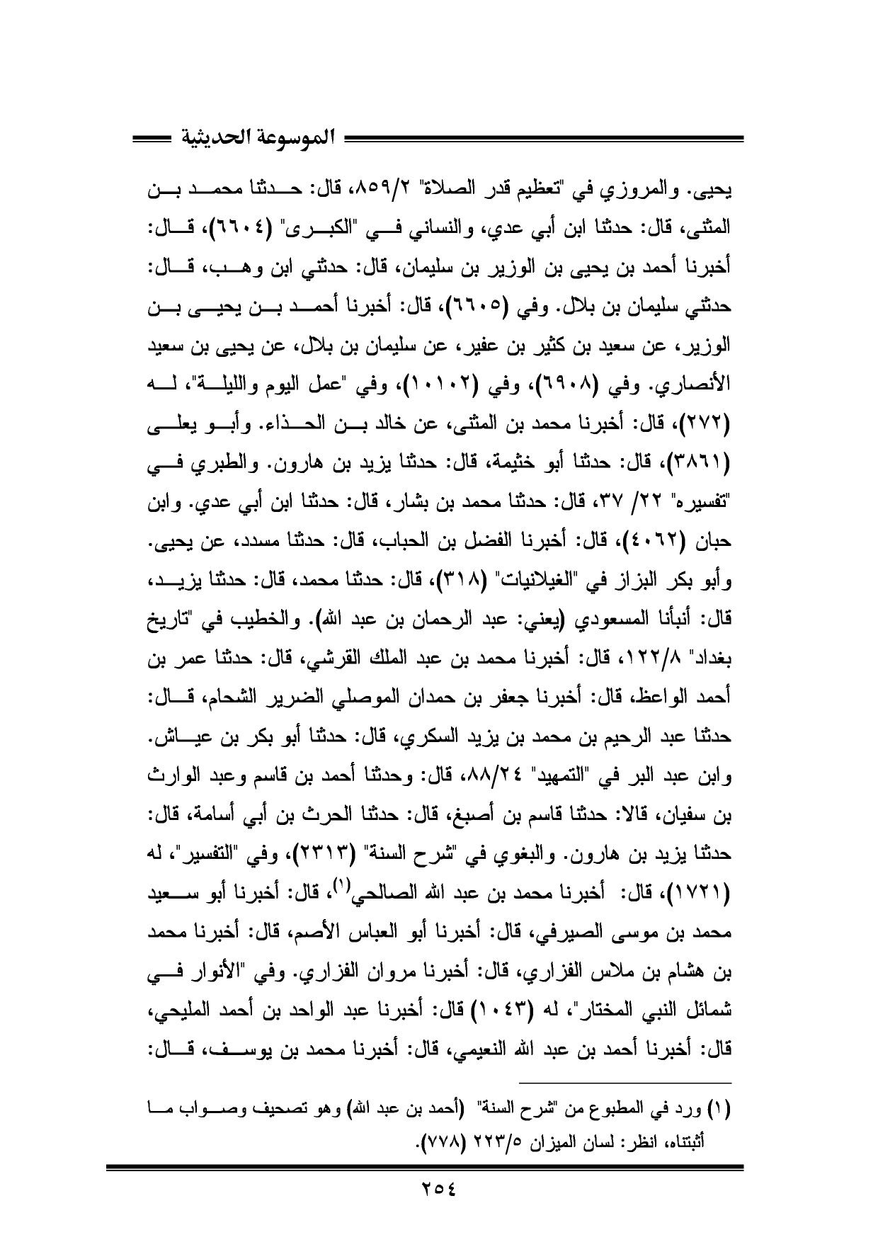 يحيى. والمروزي في "تعظيم قدر الصلاة" ٢/ ٨٥٩، قال: حدثنا محمد بن المثنى، قال: حدثنا ابن أبي عدي، والنسائي في "الكبرى" (٦٦٠٤)، قال: أخبرنا أحمد بن يحيى بن الوزير بن سليمان، قال: حدثني ابن وهب، قال: حدثني سليمان بن بلال. وفي (٦٦٠٥)، قال: أخبرنا أحمد بن يحيى بن الوزير، عن سعيد بن كثير بن عفير، عن سليمان بن بلال، عن يحيى بن سعيد الأنصاري. وفي (٦٩٠٨)، وفي (١٠١٠٢)، وفي "عمل اليوم والليلة"، له (٢٧٢)، قال: أخبرنا محمد بن المثنى، عن خالد بن الحذاء. وأبو يعلى (٣٨٦١)، قال: حدثنا أبو خثيمة، قال: حدثنا يزيد بن هارون. والطبري في "تفسيره" ٢٢/ ٣٧، قال: حدثنا محمد بن بشار، قال: حدثنا ابن أبي عدي. وابن حبان (٤٠٦٢)، قال: أخبرنا الفضل بن الحباب، قال: حدثنا مسدد، عن يحيى. وأبو بكر البزاز في "الغيلانيات" (٣١٨)، قال: حدثنا محمد، قال: حدثنا يزيد، قال: أنبأنا المسعودي (يعني: عبد الرحمان بن عبد الله). والخطيب في "تاريخ بغداد" ٨/ ١٢٢، قال: أخبرنا محمد بن عبد الملك القرشي، قال: حدثنا عمر بن أحمد الواعظ، قال: أخبرنا جعفر بن حمدان الموصلي الضرير الشحام، قال: حدثنا عبد الرحيم بن محمد بن يزيد السكري، قال: حدثنا أبو بكر بن عياش. وابن عبد البر في "التمهيد" ٢٤/ ٨٨، قال: وحدثنا أحمد بن قاسم وعبد الوارث بن سفيان، قالا: حدثنا قاسم بن أصبغ، قال: حدثنا الحرث بن أبي أسامة، قال: حدثنا يزيد بن هارون. والبغوي في "شرح السنة" (٢٣١٣)، وفي "التفسير"، له (١٧٢١)، قال: أخبرنا محمد بن عبد الله الصالحي (¬١)، قال: أخبرنا أبو سعيد محمد بن موسى الصيرفي، قال: أخبرنا أبو العباس الأصم، قال: أخبرنا محمد بن هشام بن ملاس الفزاري، قال: أخبرنا مروان الفزارى. وفي "الأنوار في شمائل النبي المختار"، له (١٠٤٣) قال: أخبرنا عبد الواحد بن أحمد المليحي، قال: أخبرنا أحمد بن عبد الله النعيمي، قال: أخبرنا محمد بن يوسف، قال: