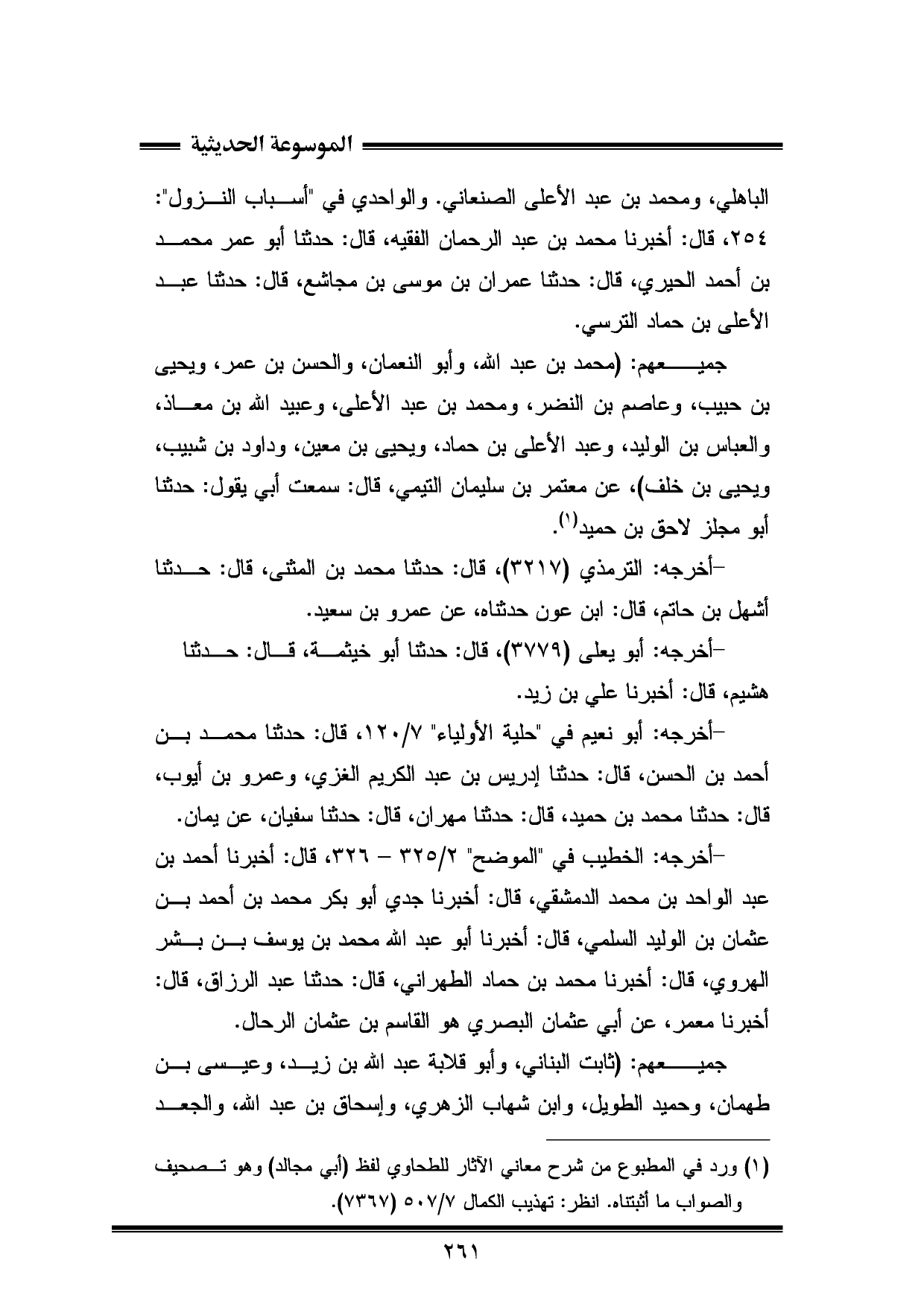 الباهلي، ومحمد بن عبد الأعلى الصنعاني. والواحدي في "أسباب النزول": ٢٥٤، قال: أخبرنا محمد بن عبد الرحمان الفقيه، قال: حدثنا أبو عمر محمد بن أحمد الحيري، قال: حدثنا عمران بن موسى بن مجاشع، قال: حدثنا عبد الأعلى بن حماد الترسي.