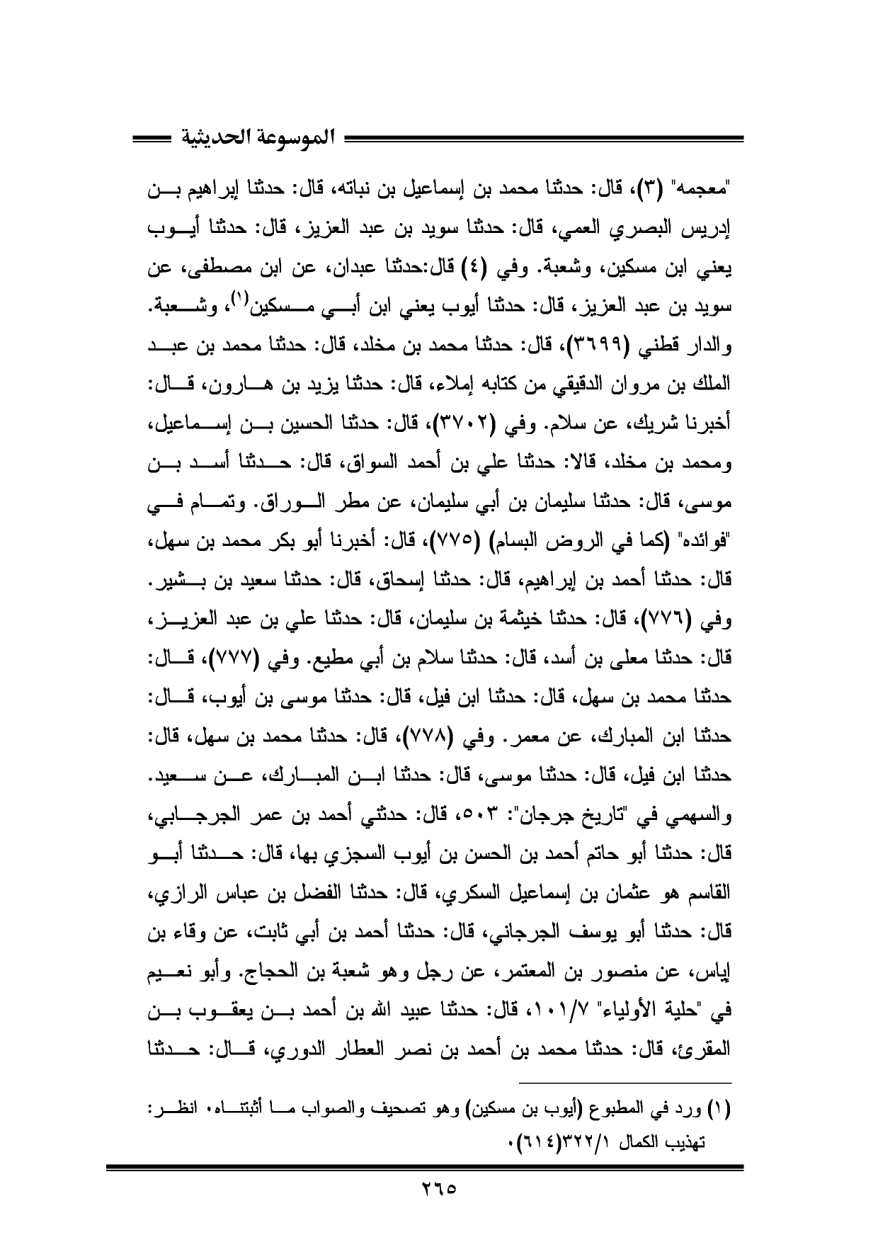 "معجمه" (٣)، قال: حدثنا محمد بن إسماعيل بن نباته، قال: حدثنا إبراهيم بن إدريس البصري العمي، قال: حدثنا سويد بن عبد العزيز، قال: حدثنا أيوب يعني ابن مسكين، وشعبة. وفي (٤) قال: حدثنا عبدان، عن ابن مصطفى، عن سويد بن عبد العزيز، قال: حدثنا أيوب يعني ابن أبي مسكين (¬١)، وشعبة. والدارقطني (٣٦٩٩)، قال: حدثنا محمد بن مخلد، قال: حدثنا محمد بن عبد الملك بن مروان الدقيقي من كتابه إملاء، قال: حدثنا يزيد بن هارون، قال: أخبرنا شريك، عن سلام. وفي (٣٧٠٢)، قال: حدثنا الحسين بن إسماعيل، ومحمد بن مخلد، قالا: حدثنا علي بن أحمد السواق، قال: حدثنا أسد بن موسى، قال: حدثنا سليمان بن أبي سليمان، عن مطر الوراق. وتمام في "فوائده" (كما في الروض البسام) (٧٧٥)، قال: أخبرنا أبو بكر محمد بن سهل، قال: حدثنا أحمد بن إبراهيم، قال: حدثنا إسحاق، قال: حدثنا سعيد بن بشير. وفي (٧٧٦)، قال: حدثنا خيثمة بن سليمان، قال: حدثنا علي بن عبد العزيز، قال: حدثنا معلى بن أسد، قال: حدثنا سلام بن أبي مطيع. وفي (٧٧٧)، قال: حدثنا محمد بن سهل، قال: حدثنا ابن فيل، قال: حدثنا موسى بن أيوب، قال: حدثنا ابن المبارك، عن معمر. وفي (٧٧٨)، قال: حدثنا محمد بن سهل، قال: حدثنا ابن فيل، قال: حدثنا موسى، قال: حدثنا ابن المبارك، عن سعيد. والسهمي في "تاريخ جرجان": ٥٠٣، قال: حدثني أحمد بن عمر الجرجابي، قال: حدثنا أبو حاتم أحمد بن الحسن بن أيوب السجزي بها، قال: حدثنا أبو القاسم هو عثمان بن إسماعيل السكري، قال: حدثنا الفضل بن عباس الرازي، قال: حدثنا أبو يوسف الجرجاني، قال: حدثنا أحمد بن أبي ثابت، عن وقاء بن إياس، عن منصور بن المعتمر، عن رجل وهو شعبة بن الحجاج. وأبو نعيم في "حلية الأولياء" ٧/ ١٠١، قال: حدثنا عبيد الله بن أحمد بن يعقوب بن المقرئ، قال: حدثنا محمد بن أحمد بن نصر العطار الدوري، قال: حدثنا
