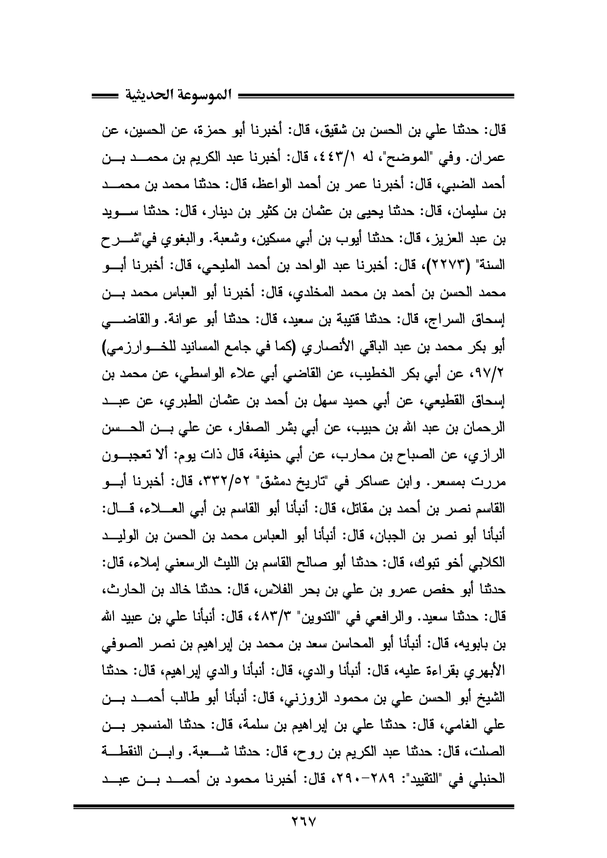 قال: حدثنا علي بن الحسن بن شقيق، قال: أخبرنا أبو حمزة، عن الحسين، عن عمران. وفي "الموضح"، له ١/ ٤٤٣، قال: أخبرنا عبد الكريم بن محمد بن أحمد الضبي، قال: أخبرنا عمر بن أحمد الواعظ، قال: حدثنا محمد بن محمد بن سليمان، قال: حدثنا يحيى بن عثمان بن كثير بن دينار، قال: حدثنا سويد بن عبد العزيز، قال: حدثنا أيوب بن أبي مسكين، وشعبة. والبغوي في "شرح السنة" (٢٢٧٣)، قال: أخبرنا عبد الواحد بن أحمد المليحي، قال: أخبرنا أبو محمد الحسن بن أحمد بن محمد المخلدي، قال: أخبرنا أبو العباس محمد بن إسحاق السراج، قال: حدثنا قتيبة بن سعيد، قال: حدثنا أبو عوانة. والقاضي أبو بكر محمد بن عبد الباقي الأنصاري (كما في جامع المسانيد للخوارزمي) ٢/ ٩٧، عن أبي بكر الخطيب، عن القاضي أبي علاء الواسطي، عن محمد بن إسحاق القطيعي، عن أبي حميد سهل بن أحمد بن عثمان الطبري، عن عبد الرحمان بن عبد الله بن حبيب، عن أبي بشر الصفار، عن علي بن الحسن الرازي، عن الصباح بن محارب، عن أبي حنيفة، قال ذات يوم: ألا تعجبون مررت بمسعر. وابن عساكر في "تاريخ دمشق" ٥٢/ ٣٣٢، قال: أخبرنا أبو القاسم نصر بن أحمد بن مقاتل، قال: أنبأنا أبو القاسم بن أبي العلاء، قال: أنبأنا أبو نصر بن الجبان، قال: أنبأنا أبو العباس محمد بن الحسن بن الوليد الكلابي أخو تبوك، قال: حدثنا أبو صالح القاسم بن الليث الرسعني إملاء، قال: حدثنا أبو حفص عمرو بن علي بن بحر الفلاس، قال: حدثنا خالد بن الحارث، قال: حدثنا سعيد. والرافعي في "التدوين" ٣/ ٤٨٣، قال: أنبأنا علي بن عبيد الله بن بابويه، قال: أنبأنا أبو المحاسن سعد بن محمد بن إبراهيم بن نصر الصوفي الأبهري بقراءة عليه، قال: أنبأنا والدي، قال: أنبأنا والدي إبراهيم، قال: حدثنا الشيخ أبو الحسن علي بن محمود الزوزني، قال: أنبأنا أبو طالب أحمد بن علي الغامي، قال: حدثنا علي بن إبراهيم بن سلمة، قال: حدثنا المنسجر بن الصلت، قال: حدثنا عبد الكريم بن روح، قال: حدثنا شعبة. وابن النقطة الحنبلي في "التقييد": ٢٨٩ - ٢٩٠، قال: أخبرنا محمود بن أحمد بن عبد