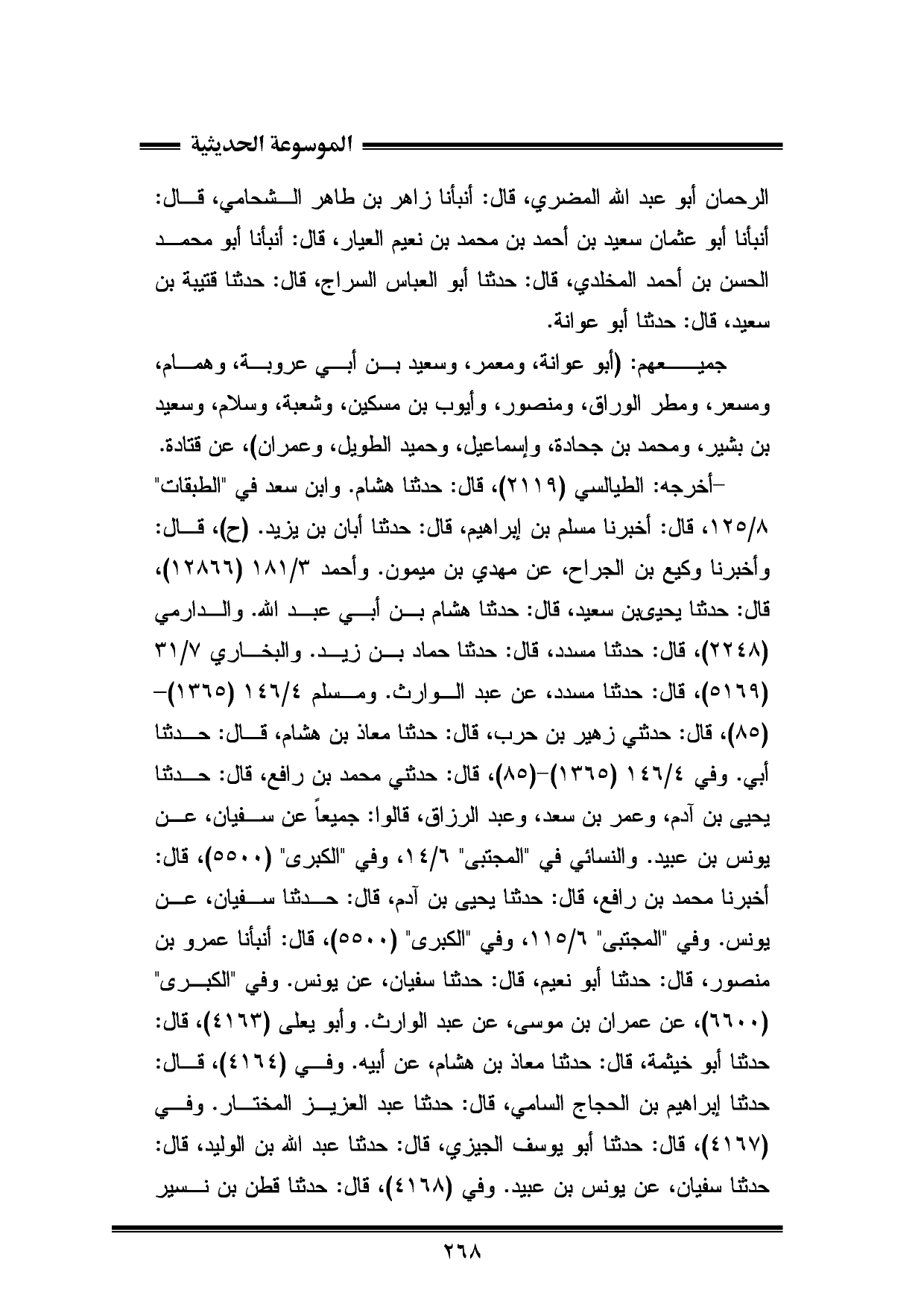 الرحمان أبو عبد الله المضري، قال: أنبأنا زاهر بن طاهر الشحامي، قال: أنبأنا أبو عثمان سعيد بن أحمد بن محمد بن نعيم العيار، قال: أنبأنا أبو محمد الحسن بن أحمد المخلدي، قال: حدثنا أبو العباس السراج، قال: حدثنا قتيبة بن سعيد، قال: حدثنا أبو عوانة.