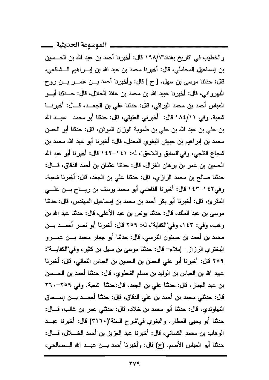 والخطيب في "تاريخ بغداد" ٧/ ١٩٨ قال: أخبرنا أحمد بن عبد اللَّه بن الحسين بن إسماعيل المحاملي، قال: أخبرنا محمد بن عبد اللَّه بن إبراهيم الشافعي، قال: حدثنا موسى بن سهل. [ح] قال: وأخبرنا أحمد بن عمر بن روح النهرواني، قال: أخبرنا عبيد اللَّه بن محمد بن عائذ الخلال، قال: حدثنا أبو العباس أحمد بن محمد البرائي، قال: حدثنا علي بن الجعد، قال: أخبرنا شعبة. وفي ١١/ ١٨٤ قال: أخبرني العتيقي، قال: حدثنا أبو محمد عبد اللَّه بن علي بن عبد اللَّه بن علي بن طموبة الوزان الموذن، قال: حدثنا أبو الحسن محمد بن إبراهيم بن حبيش البغوي المعدل، قال: أخبرنا أبو عبد اللَّه محمد بن شجاع الثلجي، وفي "السابق واللاحق"، له: ١٤١ - ١٤٢ قال: أخبرنا أبو عبد اللَّه الحسين بن عمر بن برهان الترال، قال: حدثنا عثمان بن أحمد الدقاق، قال: حدثنا صالح بن محمد الرازي، قال: حدثنا علي بن الجعد، قال: أخبرنا شعبة، وفي ١٤٢ - ١٤٣ قال: أخبرنا القاضي أبو محمد يوسف بن رباح بن علي المقرئ، قال: أخبرنا أبو بكر أحمد بن محمد بن إسماعيل المهندس، قال: حدثنا موسى بن عبد الملك، قال: حدثنا يونس بن عبد الأعلى، قال: حدثنا عبد اللَّه بن وهب، وفي: ١٤٣، وفي "الكفاية"، له: ٢٥٩ قال: أخبرنا أبو نصر أحمد بن محمد بن أحمد بن حسنون النرسي، قال: حدثنا أبو جعفر محمد بن عمرو البختري الرزاز -إملاء- قال: حدثنا موسى بن سهل بن كثير، وفي "الكفاية": ٢٥٩ قال: أخبرنا أبو علي الحسن بن الحسين بن العباس النعالي، قال: أخبرنا عبيد اللَّه بن العباس بن الوليد بن مسلم الشطوي، قال: حدثنا أحمد بن الحسن بن عبد الجبار، قال: حدثنا علي بن الجعد، قال: حدثنا شعبة. وفي ٢٥٩ - ٢٦٠ قال: حدثني محمد بن أحمد بن علي الدقاق، قال: حدثنا أحمد بن إسحاق النهاوندي، قال: حدثنا أبو محمد بن خلاد، قال: حدثني عمر بن غالب، قال: حدثنا أبو يحيى العطار. والبغوي في "شرح السنة" (٣١٦٠) قال: أخبرنا عبد الوهاب بن محمد الكسائي، قال: أخبرنا عبد العزيز بن أحمد الخلال، قال: حدثنا أبو العباس الأصم. (ح) قال: وأخبرنا أحمد بن عبد اللَّه الصالحي،