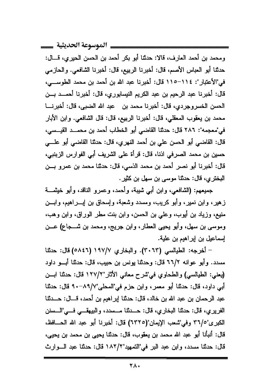 ومحمد بن أحمد العارف، قالا: حدثنا أبو بكر أحمد بن الحسن الحيري، قال: حدثنا أبو العباس الأصم، قال: أخبرنا الربيع، قال: أخبرنا الشافعي. والحازمي في "الأعتبار": ١١٤ - ١١٥ قال: أخبرنا عبد اللَّه بن أحمد بن محمد الطوسي، قال: أخبرنا عبد الرحيم بن عبد الكريم النيسابوري، قال: أخبرنا أحمد بن الحسن الخسروجردي، قال: أخبرنا محمد بن عبد اللَّه الضبي، قال: أخبرنا محمد بن يعقوب المعقلي، قال: أخبرنا الربيع، قال: قال الشافعي. وابن الأبار في "معجمه": ٢٨٦ قال: حدثنا القاضي أبو الخطاب أحمد بن محمد القيسي، قال: القاضي أبو الحسن علي بن أحمد النهري، قال: حدثنا القاضي أبو علي حسين بن محمد الصرفي اذنا، قال: قرأة على الشريف أبي الفوارس الزبنبي، قال: أخبرنا أبو نصر أحمد بن محمد الذسي، قال: حدثنا محمد بن عمرو بن البخترى، قال: حدثنا موسى بن سهل بن كثير.
