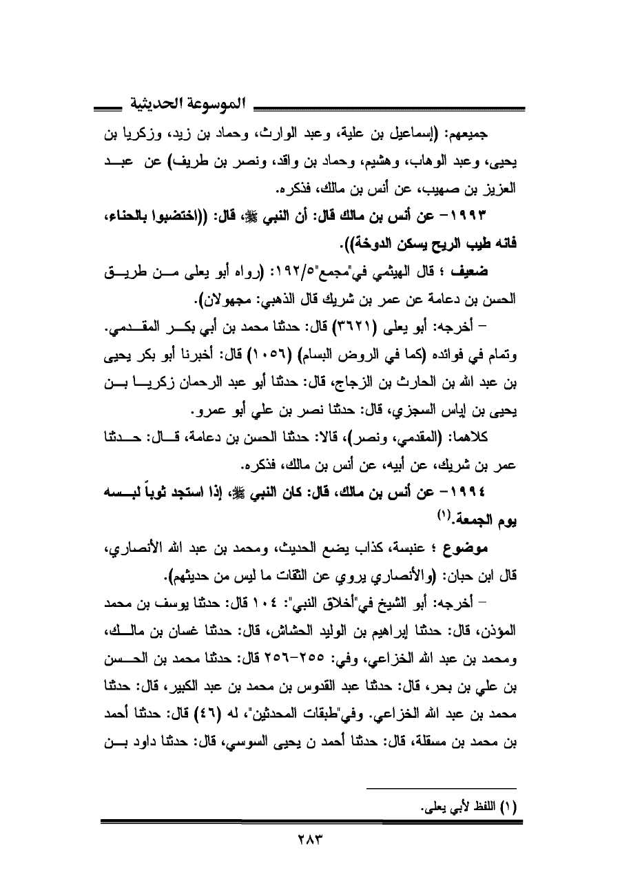 ١٩٩٣ - عن أنس بن مالك قال: أن النبي -صلى اللَّه عليه وسلم-، قال: "اختضبوا بالحناء، فإنه طيب الريح يسكن الدوخة".