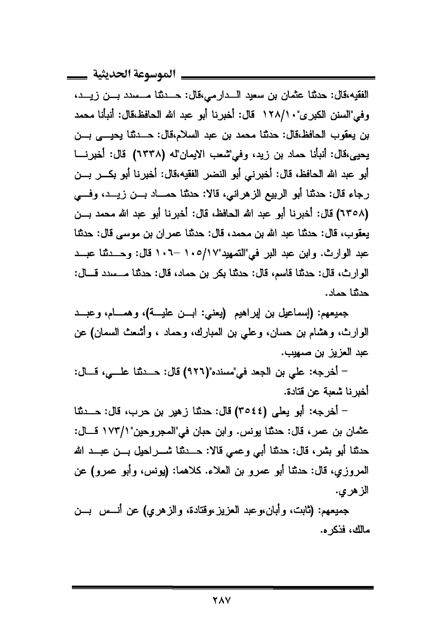 الفقيه، قال: حدثنا عثمان بن سعيد الدارمي، قال: حدثنا مسدد بن زيد، وفي "السنن الكبرى" ١٠/ ١٢٨ قال: أخبرنا أبو عبد اللَّه الحافظ، قال: أنبأنا محمد بن يعقوب الحافظ، قال: حدثنا محمد بن عبد السلام، قال: حدثنا يحيى بن يحيى، قال: أنبأنا حماد بن زيد، وفي "شعب الإيمان" له (٦٣٣٨) قال: أخبرنا أبو عبد اللَّه الحافظ، قال: أخبرني أبو النضر الفقيه، قال: أخبرنا أبو بكر بن رجاء قال: حدثنا أبو الربيع الزهراني، قالا: حدثنا حماد بن زيد، وفي (٦٣٥٨) قال: أخبرنا أبو عبد اللَّه الحافظ، قال: أخبرنا أبو عبد اللَّه محمد بن يعقوب، قال: حدثنا عبد اللَّه بن محمد، قال: حدثنا عمران بن موسى قال: حدثنا عبد الوارث. وابن عبد البر في "التمهيد" ١٧/ ١٠٥ - ١٠٦ قال: وحدثنا عبد الوارث، قال: حدثنا قاسم، قال: حدثنا بكر بن حماد، قال: حدثنا مسدد قال: حدثنا حماد.