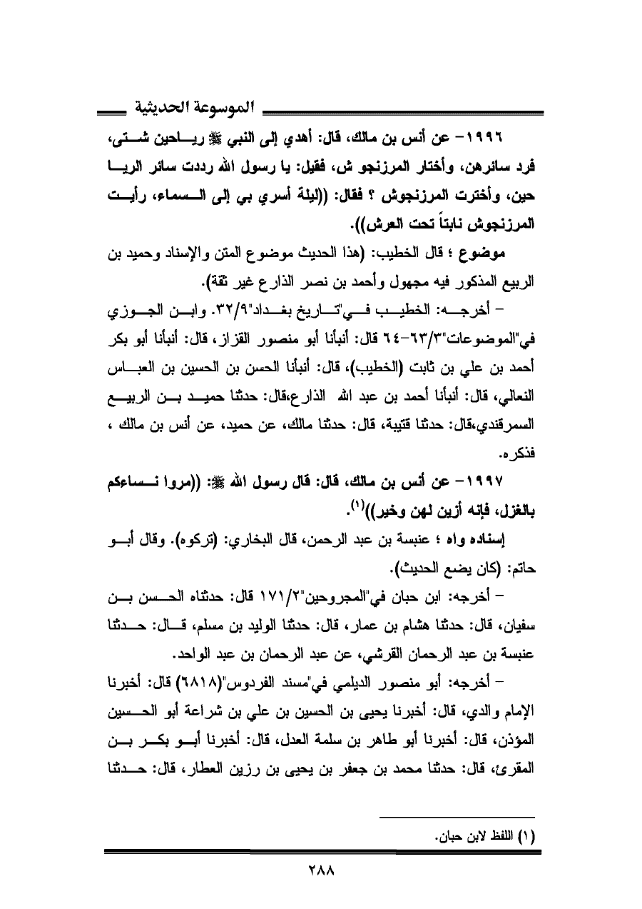 ١٩٩٦ - عن أنس بن مالك، قال: أهدي إلى النبي -صلى اللَّه عليه وسلم- رياحين شتى، فرد سائرهن، وأختار المرزنجوش، فقيل: يا رسول اللَّه رددت سائر الرياحين، وأخترت المرزنجوش؟ فقال: "ليلة أسري بي إلى السماء، رأيت المرزنجوش نابتًا تحت العرش".