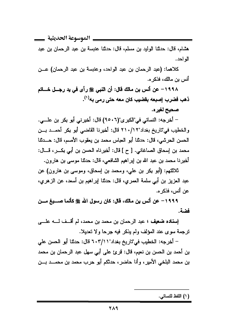 ١٩٩٨ - عن أنس بن مالك قال: أن النبي -صلى اللَّه عليه وسلم- رأى في يد رجل خاتم ذهب فضرب إصبعه بقضيب كان معه حتى رمى به (¬١).