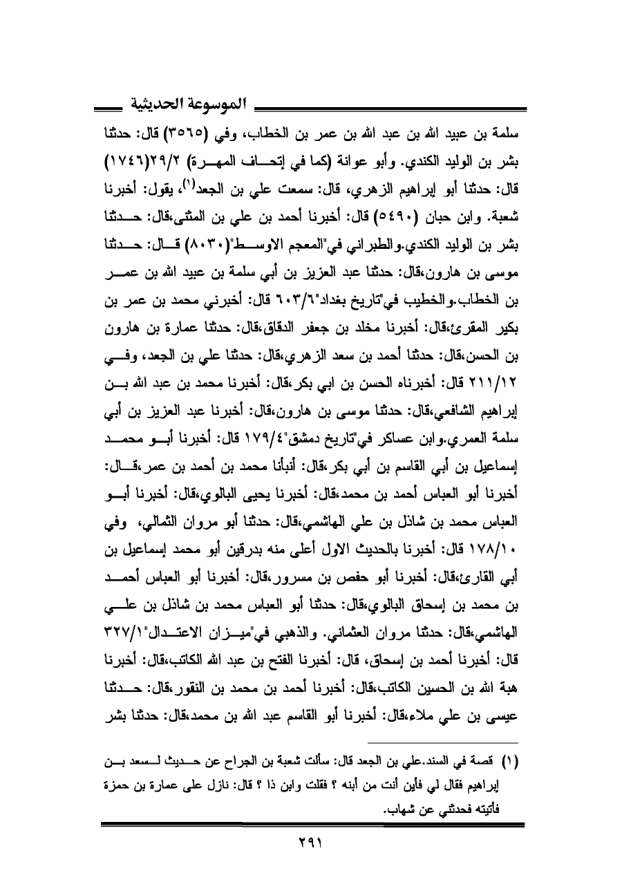 (¬١) قصة في السند. علي بن الجعد قال: سألت شعبة بن الجراح عن حديث لسعد بن إبراهيم فقال لي فأين أنت من أبنه؟ فقلت وابن ذا؟ قال: نازل على عمارة بن حمزة فأتيته فحدثني عن شهاب.