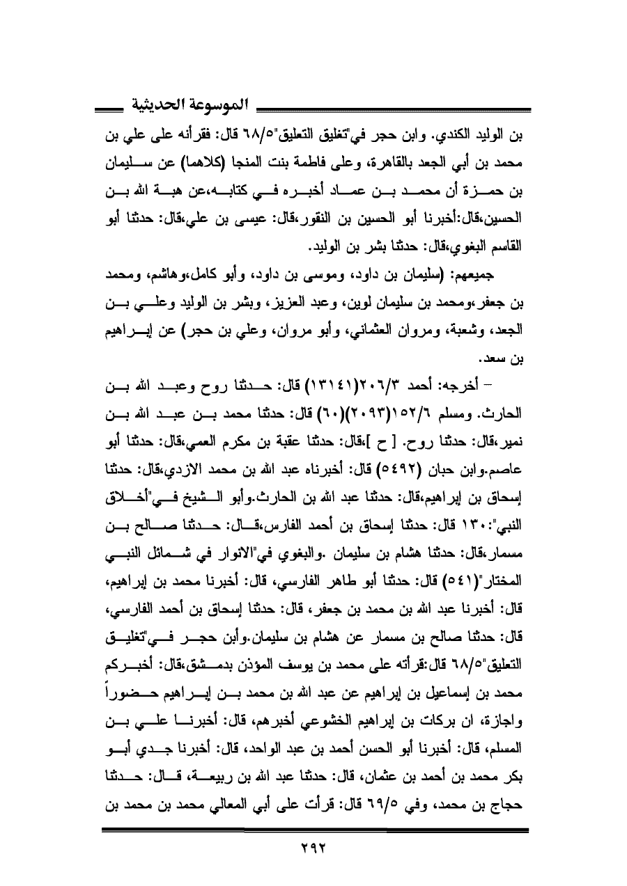 جميعهم: (سليمان بن داود، وموسى بن داود، وأبو كامل، وهاشم، ومحمد بن جعفر، ومحمد بن سليمان لوين، وعبد العزيز، وبشر بن الوليد وعلي بن الجعد، وشعبة، ومروان العثماني، وأبو مروان، وعلي بن حجر) عن إبراهيم بن سعد.
